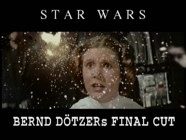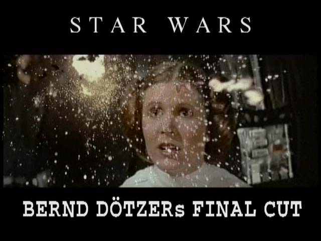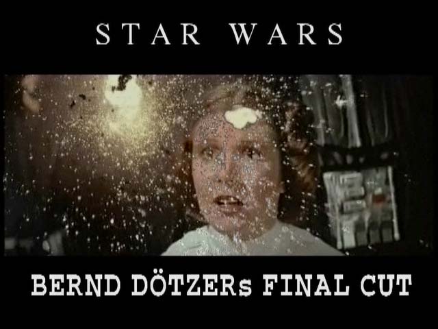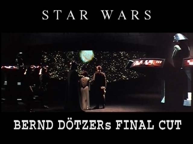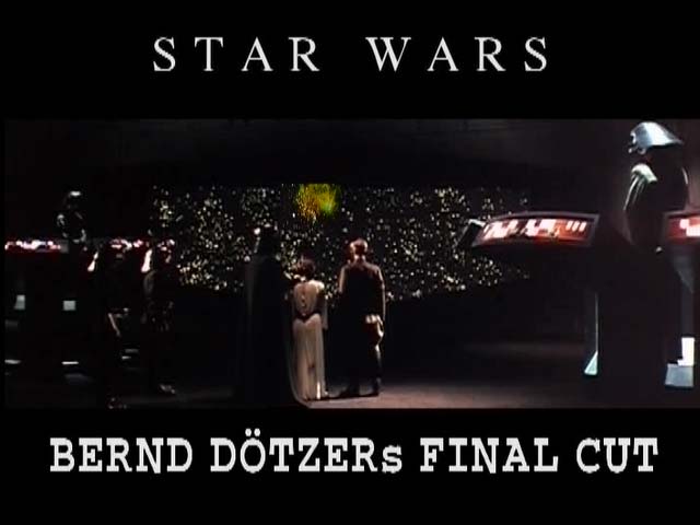 Das offizielle DVD-Bonusmaterial hält eine Szene bereit, bei deren erster Betrachtung mir schon klar war, daß diese unbedingt ihren Weg in den BERND DÖTZERs FINAL CUT finden mußte: In einer Totalen des Todesstern-Kontrollraums sind von hinten Vader, Leia und Tarkin zu sehen. Links und rechts im Bild sind Steuerpulte mit imperialem Bedienpersonal platziert. Die Blicke aller Anwesenden richten sich auf das große Panoramafenster. Der Weltraum mit zahllosen Sternen ist durch die gepanzerte Scheibe zu sehen. Nichts sonst. Kein Planet, keine Explosion, keine Bruchstücke. Der Ton wird merklich hochgedreht, das Surren der Panavision-Kamera ist zu vernehmen. Nun spricht Leia ihre bemerkenswerten Worte: „Und Sie bezeichnen sich selbst als Menschen.“ In kurzer Stille, nur die Kamera ist vernehmbar, verharrt die Aufnahme, bis sie abbricht.