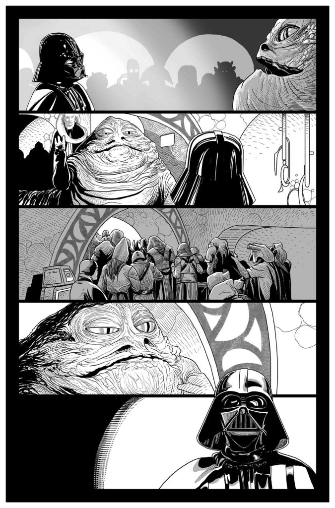 Salvador, wir sehen, wie Vader an einem uns sehr bekannten Ort ankommt – Jabbas Palast. Wie haben Sie entschieden, den Hintergrund dieser Seiten zu besetzen? Und wenn der Film Orte nicht zeigte, welche das Skript für Ihre Layouts verlangte, wie haben Sie diese gefüllt?