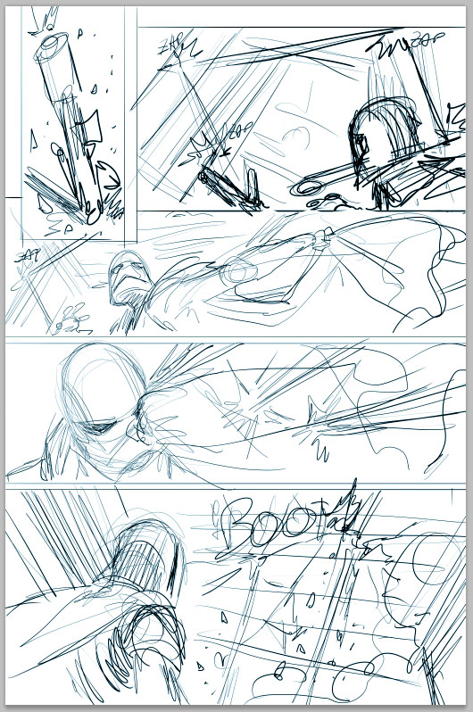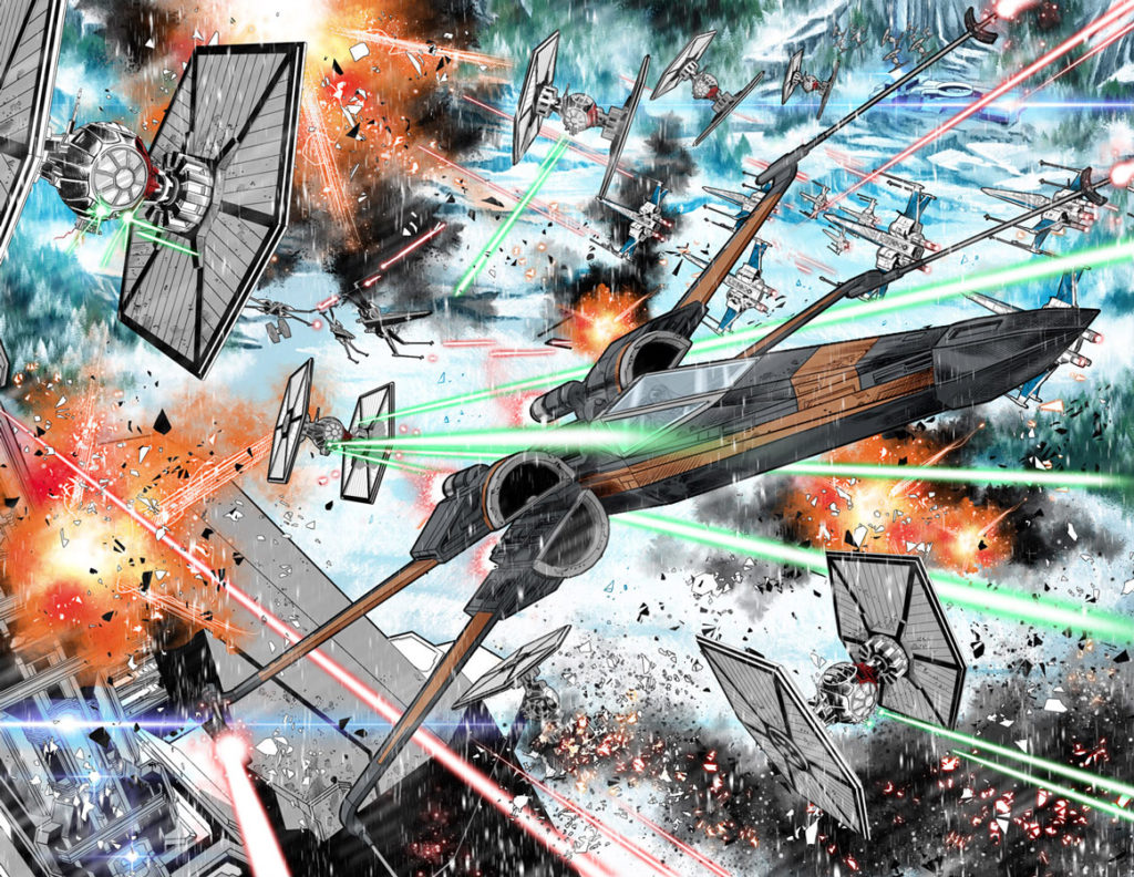 Seite 1: Nun, da ich an Captain Phasma gearbeitet habe, hatte ich Gelegenheit, an jeder Ära in Star Wars mitzuarbeiten; Obi-Wan und Anakin spielen zur Zeit der Prequels, Shattered Empire und The Screaming Citadel zur Zeit der klassischen Trilogie und nun treten wir in die Ära der Sequels ein. Die erste Seite fiel mir am schwersten, ich habe sie erst ganz zu Schluss meiner Arbeit an Band #1 gemacht. Wir wollten mit einer Riesenportion Phasma starten und ein kleines Easter Egg einbauen. Die Tür hinter ihr ist dieselbe wie die in Episode IV.