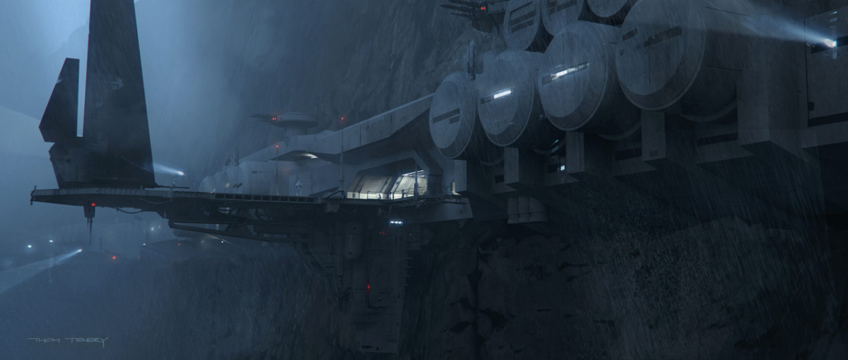 Das Design selbst basiert auf einer alten Skizze von Ralph McQuarrie. Die vier Zylinder, die aus der Felswand ragen, schreien geradezu Ralph McQuarrie und Star Wars. An ihnen haben wir das gesamte Design der Basis aufgehängt und danach eine Landeplattform hinzugefügt, die deutlich macht, dass es sich um eine sehr imperiale Basis handelt. Oftmals beginnen wir schon sehr früh, imperiale Designelemente einzustreuen, wenn es um einen imperialen Standort geht. Die Türen und die gesamte Formensprache, z.B. die pillenförmigen Lampen, die auf den ersten Blick für die imperiale Architektur stehen, werden so zum elementaren Bestandteil des Gesamtdesigns.