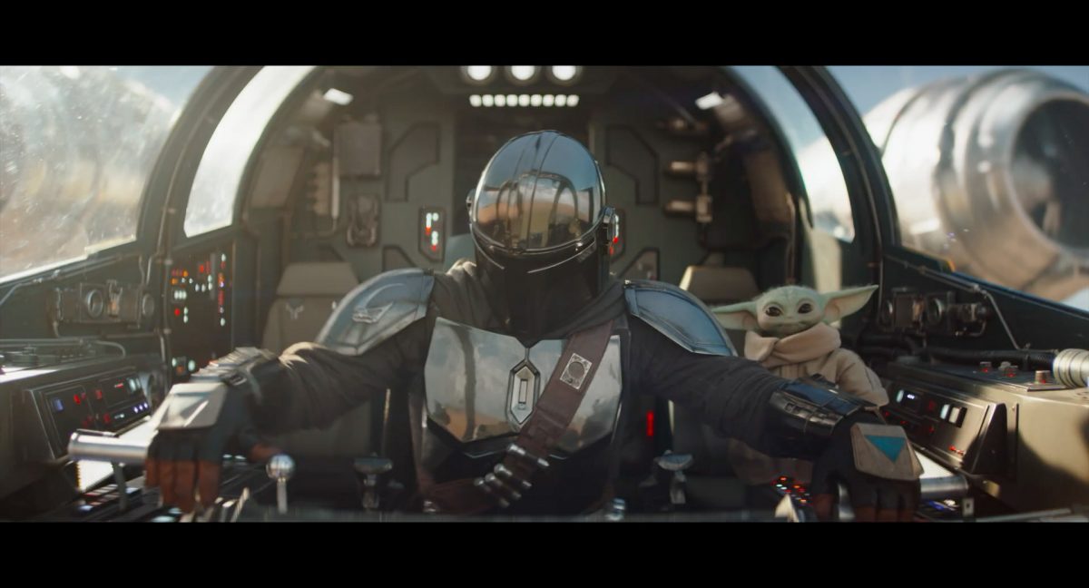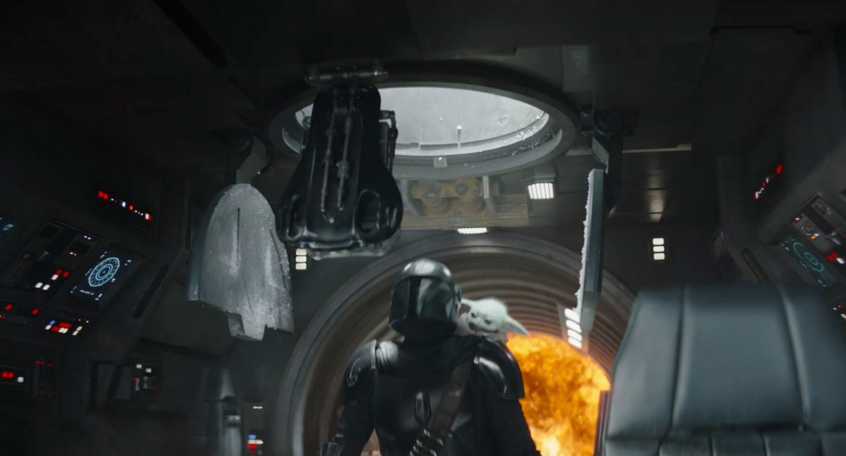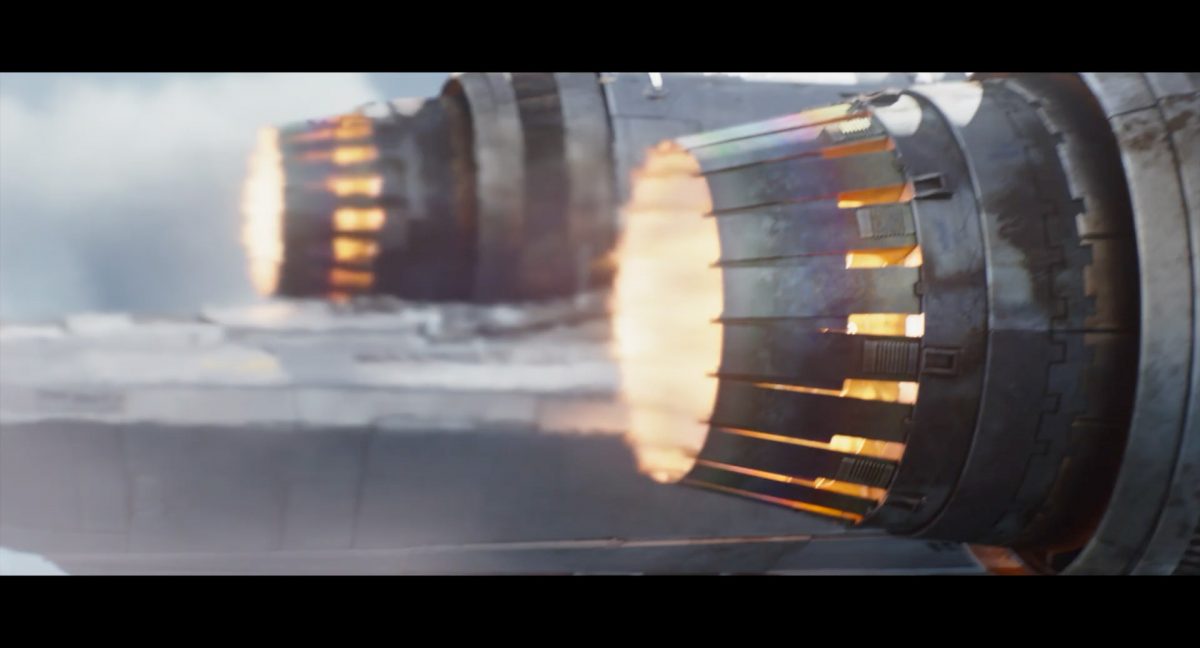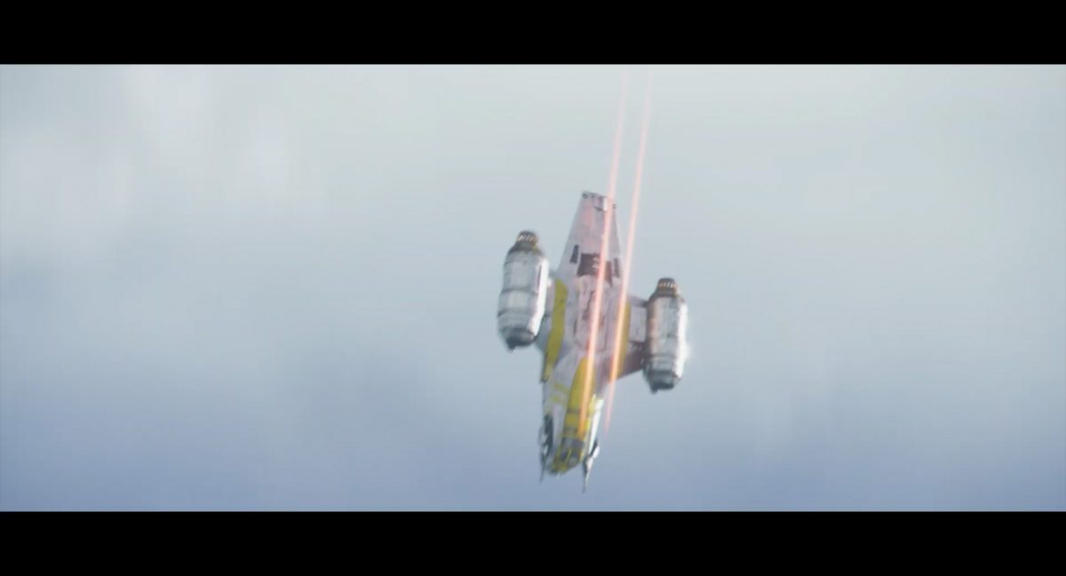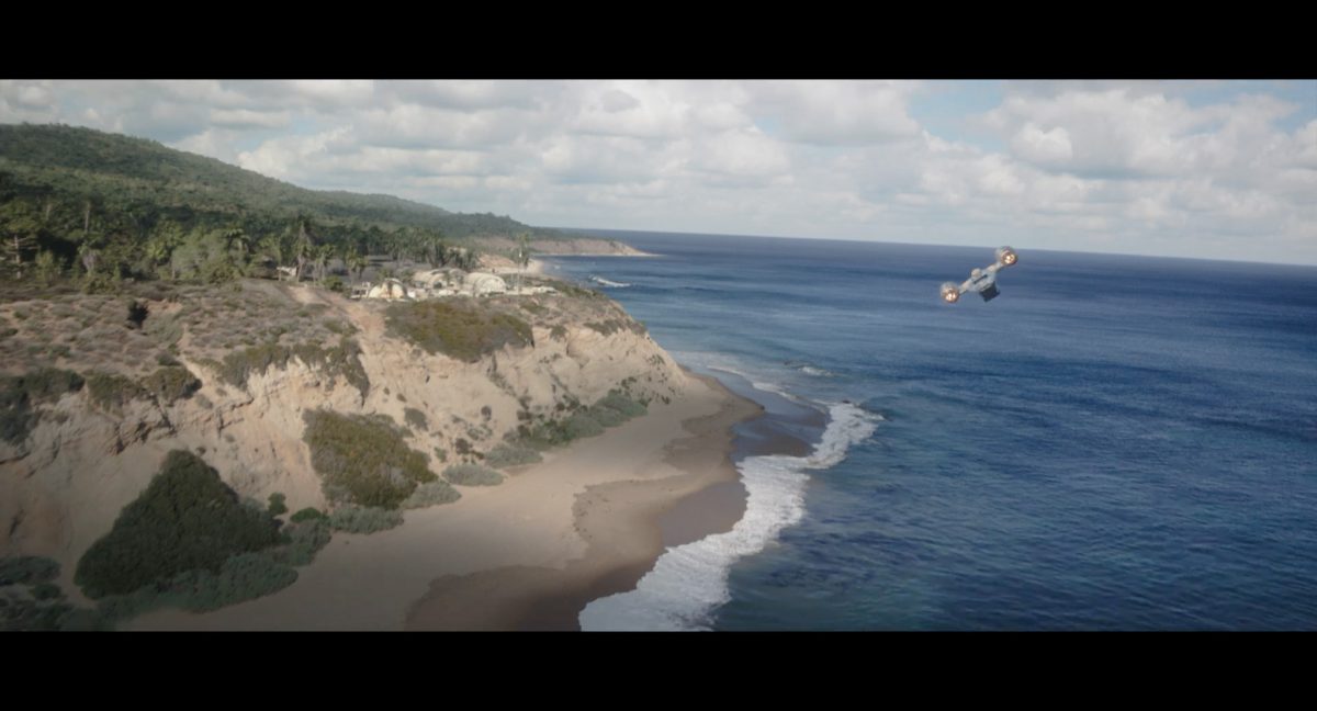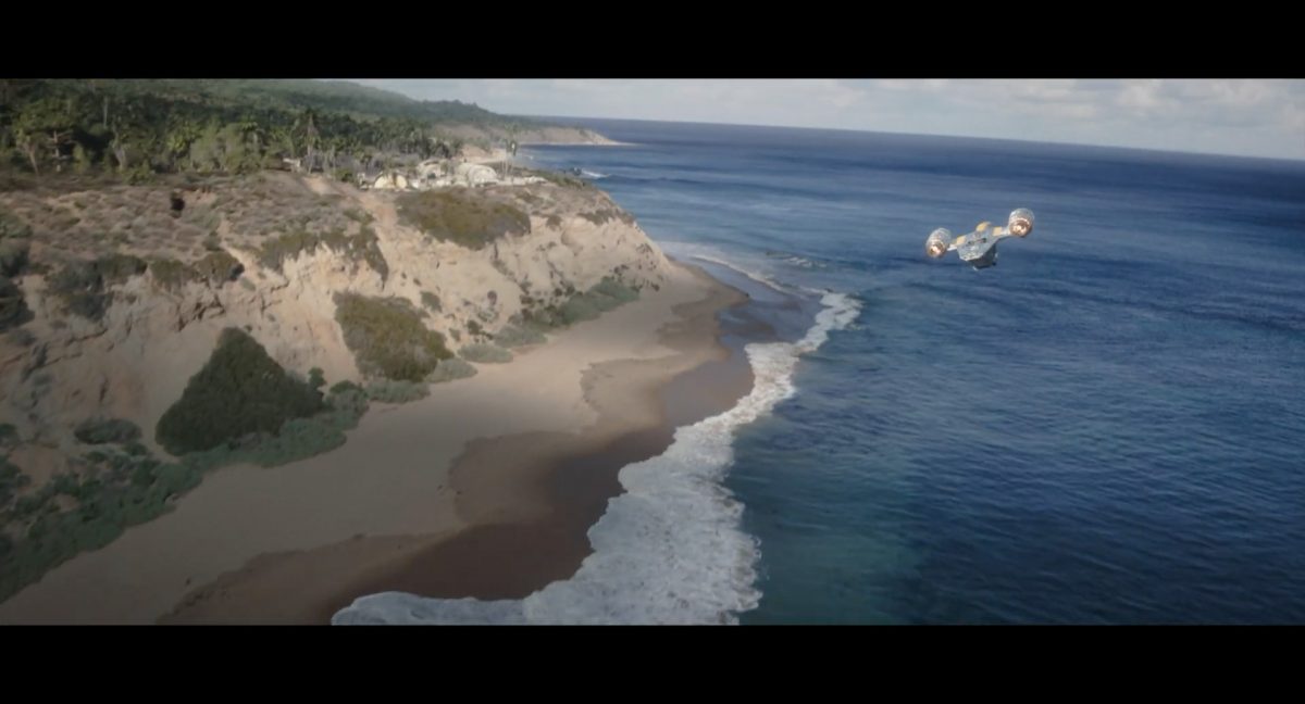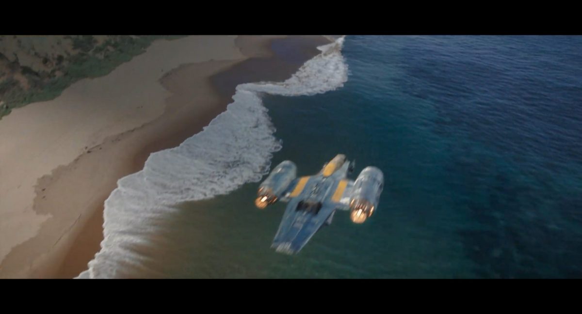 Die ersten Sekunden dieses Teasertrailers offenbaren uns den Blick auf einen Strand aus großer Höhe, welchen wir mit einer konstanten Geschwindigkeit zu überfliegen scheinen, während sich die sanften Wellen des türkis blaugrünen Meeres schäumend über den Sand ergießen. Auditiv begleitet wird die von Wolkenfetzen beschattete Szenerie von einem einschneidenden typischen Eröffnungs-Sound.Dieser Sound vermischt sich unversehens mit dem Turbinengeräusch eines Raumschiffes, welches vom unteren Bildschirmrand aus ins Bild geflogen kommt und in dieselbe Richtung weiterfliegt, in welche die Kamera ohnehin schon unterwegs war: Wie das geübte Auge erkennt, handelt es sich um die Razor Crest, oder zumindest um ein Schiff desselben Types, sofern das Original nicht wieder zusammengesetzt worden ist. Man beachte die auffälligen gelben Markierungen, welche die reflektierende Oberseite schmücken und vage an die Lackierungen von Y-Flüglern erinnern.Während die Kamera leichthin nach oben schwenkt, um die Flugbahn des Schiffes zu verfolgen, kommt links deutlich ein den Strand säumender Felshang ins Bild.Auf der Oberseite des Hangs ist eine grüne Dschungellandschaft auszumachen, ebenso ein Camp. Die Razor Crest scheint dieses Lager anzusteuern. Es dürfte sich hierbei um die NR-Basis auf Adelphi handeln, welche zuvor bereits mehrfach in der Serie gezeigt und erwähnt wurde.Eine Schwarzblende.