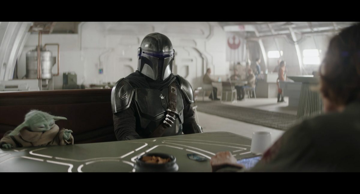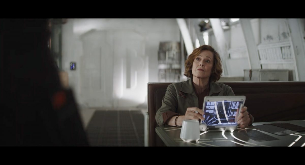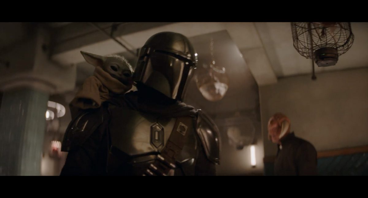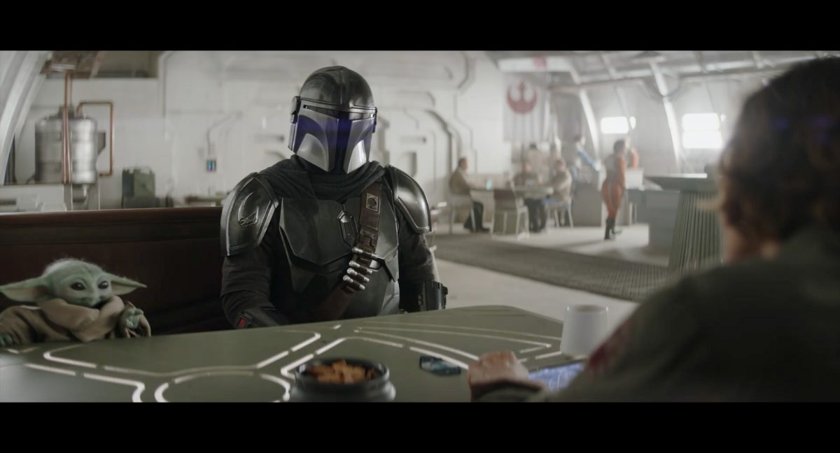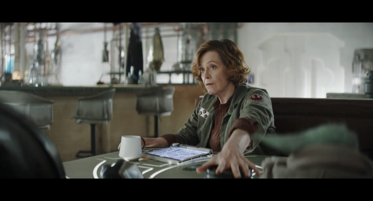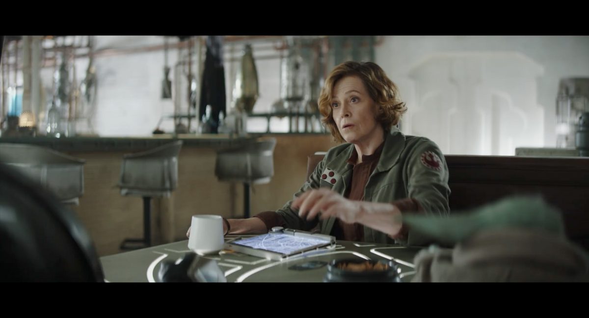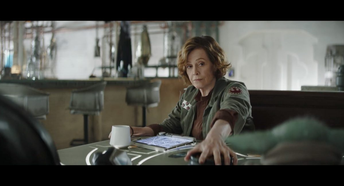 Der folgende Schnitt präsentiert, untermalt mit den anfänglichen zaghaften Tönen ihrer Titelmusik, den Mandalorianer Din Djarin (mutmaßlich dargestellt von Pedro Pascal) und seinen Adoptivsohn, den kleinen Grogu. Beide luken hinter eine Sanddüne hervor, verschwommen im Hintergrund sind sandige Hügel und ein Meer zu erkennen. Dabei benutzt Grogu offenbar ein abmontiertes Zielfernrohr als Fernglas.Klassische Makrofernglas-Optik; wer genau gerade hier durch das Visier schaut, bleibt uns vorerst verborgen. Allerdings scheint es sich der Gestaltung nach zu urteilen dabei nicht um das Visier zu handeln, welches Grogu gerade in der Hand hielt.Das Fernglas-Display hat einen schlichten holobläulichen Gesamtlook mit herausstechenden roten und gelben Zahlen-Anzeigen. Wir betrachten eine Gebäudestruktur, und als das Fernglas nach unten schwenkt, kommen mehrere Imperiale Sturmtruppler ins Bild, welche jenen Bau scheinbar am Haupttor, zu welchem eine breite, aber kurze Treppe hochführt, bewachen. Es hat den Anschein, dass ein kleiner rötlich gefärbter Speeder vor dem Gebäude steht. Überdies ist eine breite, abgerundete Säulen-Struktur vor dem Eingang angebracht.Eine weitere Schwarzblende, welcher sogleich eine Kameraperspektive in einem dunklen Tunnelnetzwerk folgt. Dort sehen wir aus einem Tunnel heraus, erleuchtet in einem schwachen Lichtkegel, die Gestalt eines kleinen Anzellaners (bekanntester Vertreter dieser Spezies ist Babu Frik aus Episode IX: Der Aufstieg Skywalkers), welcher mit einer kleinen Lampe in Richtung Kamera leuchtet. Es könnte sich dabei um einen derjenigen Anzellaner handeln, welche in der dritten Staffel bereits ihren Auftritt hatten.Nach einer Sekunde wendet er sich ab und bewegt nach rechts in den nächsten Tunnel.Noch bevor er ganz verschwunden ist, kommt hinter ihm von links Grogu ins Bild gelaufen.Er verlangsamt sein Tempo und blickt blinzelnd in unsere Richtung. Dann blendet das Bild erneut ab.Schnitt zum großen Co-Star des Films – Sigourney Weaver als Offizierin der Neuen Republik. Sie sitzt gerade, den Zuschauenden zugewandt, in der Messe der Adelphi-Basis an einem Tisch und studiert bei einer Tasse Was-auch-immer-frau-zu-dieser-Tageszeit-bei-der-Arbeit-trinkt ein Datenpad. Unter ihrem Jacken-Kragen kann man das Rangabzeichen mit den vier roten Punkten erkennen, was in dieser Anordnung auf einen Posten als Colonel hinweisen dürfte. Einen Namen für ihre Rolle haben wir zu diesem Zeitpunkt noch nicht.Als eine Gestalt – wir vermuten mal ganz stark den titelgebenden mandalorianischen Protagonisten – an sie herantritt, hebt sie den Blick, welcher uns leicht abschätzend vorkommt.Über Weavers Schulter hinweg sehen wir, wie der kleine grüne Freund des Mandos von unten an die Tischkante kommt und sich an dieser festhält. Auf dem Tisch mit einem Lichtornament verzierten metallischen Tisch ist eine Schale Cheerios oder ähnliches auszumachen.Die nächste Einstellung bestätigt uns unüberraschenderweise auch die Anwesenheit Dins bei diesem Treffen, der zu Grogus Linken Platz genommen hat. Das weiße Interieur der Basis-Messe ist im Hintergrund klar auszumachen, ebenso wie die kleine Schar anderer Gäste: Offizier- und Pilotenpersonal der Neuen Republik; letztere sind klar an ihren klassisch-orangefarbenen und blauen Flugmonturen zu erkennen. Zudem prangt das legendäre Symbol der einstigen Rebellenallianz klar und deutlich auf einem Banner.Grogu befindet sich mal wieder in einem Status der gastronomischen Selbstfindung und zieht mithilfe der Macht die Schüssel mit den Leckereien zu sich hin.Dieser Vorgang ist offenbar noch ein gewisser Kraftakt für ihn, der der Kleine kneift vor Konzentration die Kulleraugen zusammen, während die Schüssel stoßweise immer näherrückt.Sein Ziehvater nimmt den Vorgang schweigend zur Kenntnis. (Gleichzeitig kommt aufgrund ihrer Bewegungen der Verdacht auf, dass zwei der Piloten im Hintergrund eine Art von Tischkicker miteinander spielen.)Auch Colonel “Ellen Ripley” registriert den vorsätzlichen Akt des Mundraubs – ohne den Blick vom Mando abzuwenden, greift sie zur Seite und packt die Schüssel. In diesem Moment verhallt die Trailermusik.Ihren Snack fest im Griff wirft sie nun doch Grogu einen Blick zu.Dieser stellt seine Bemühungen umgehend ein und blick leicht traurig der Schüssel hinterher, welche Weavers Figur sogleich wieder in ihre Richtung zieht.Ein kauziger, aber unbestreitbar süßer Laut kommt ihm resigniert über die grünen Lippen.Mit dem unverkennbaren Mando-Sound als musikalische Untermalung kommt nun auch erstmals das chromatisierte Lucasfilm-Logo auf schwarzem Hintergrund ins Bild.Eine Stadtszenerie bei Nacht, diverse Neonschrift-Leuchten an Gebäuden … doch etwas ist verkehrt herum. Wir scheinen uns auf dem Kopf zu befinden …… denn wie wir feststellen, handelt es sich um eine Kameraeinstellung einer Pfütze, in welcher sich die Szenerie gespiegelt hat. In diesem Moment stampft ein Paar Stiefel durch eben jene Pfütze. Zu wem sie gehören, ist nicht klar ersichtlich.Das Innere einer Kantine oder sonstigen Etablissements. Ein Tisch mit abgerundeten Ecken und vier gepolsterten Stühlen, auf welchem noch ein paar Gläser ruhen befindet sich im Raum. Dahinter ist eine Bar auszumachen, mit einer roten Theke, deren dunkle Tischplatte scheinbar von unten beleuchtet wird. Eine oval geformte Auslassung in der graugrün gekachelten Wand beinhaltet mehrere Glasgefäße mit mutmaßlich verschiedenen Spirituosen.Im Vordergrund der Szene befindet sich Din Djarin, welcher sich gerade in einer Konfrontation mit einem Gegner befindet, den er sogleich mit einem heftigen Tritt in die Magengrube begegnet. Die fremde Gestalt wirkt einigermaßen humanoid und scheint eine Art hellbraunen Trenchcoat zu tragen.Einen schnellen Schnitt später fliegt eine Figur (auf den ersten Blick könnte es dieselbe sein, aber auf den zweiten wirkt es eher wie eine andere, denn die Kleidung wirkt vom Farbton etwas dunkler und and