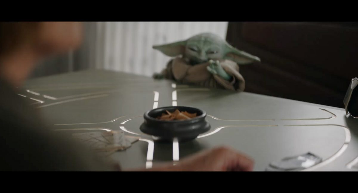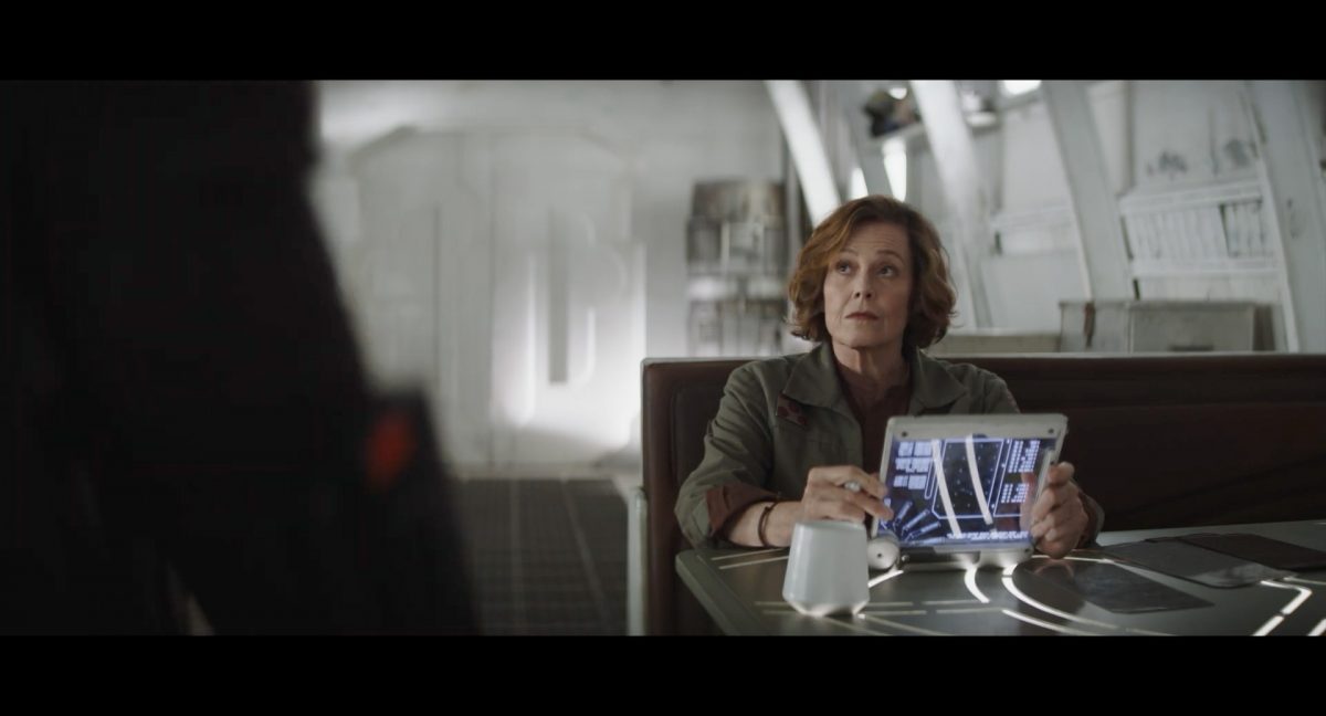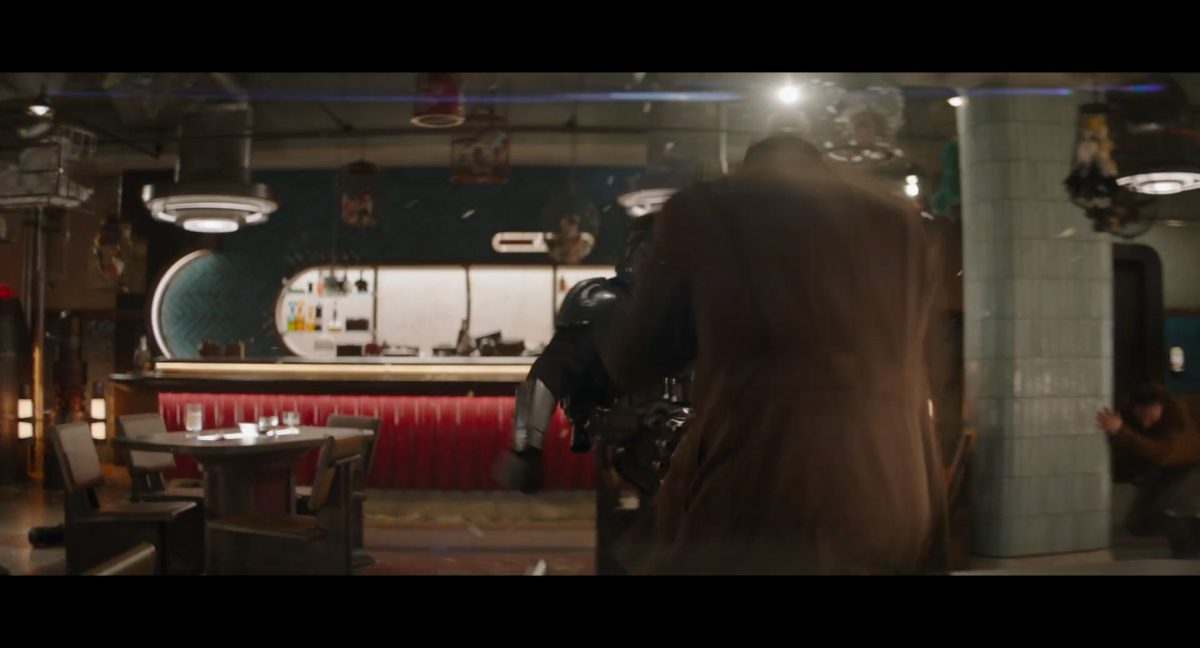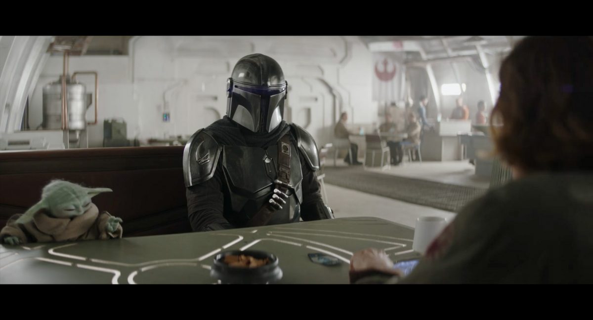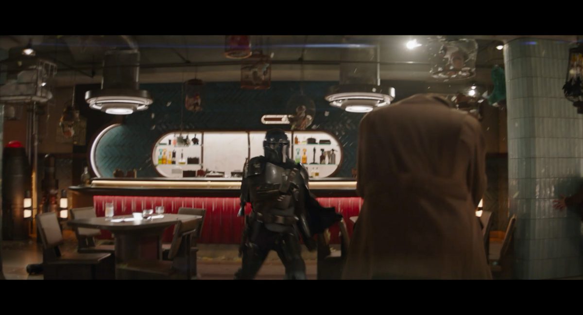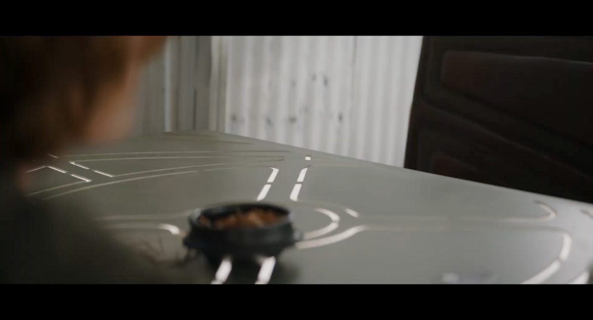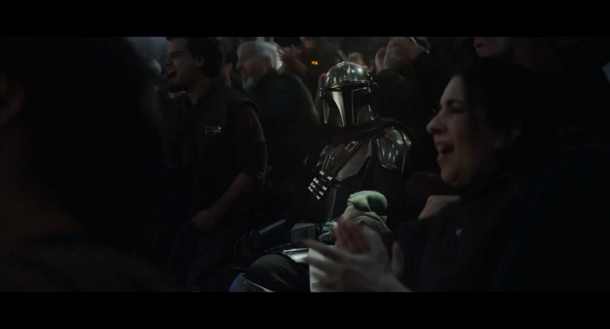 Der folgende Schnitt präsentiert, untermalt mit den anfänglichen zaghaften Tönen ihrer Titelmusik, den Mandalorianer Din Djarin (mutmaßlich dargestellt von Pedro Pascal) und seinen Adoptivsohn, den kleinen Grogu. Beide luken hinter eine Sanddüne hervor, verschwommen im Hintergrund sind sandige Hügel und ein Meer zu erkennen. Dabei benutzt Grogu offenbar ein abmontiertes Zielfernrohr als Fernglas.Klassische Makrofernglas-Optik; wer genau gerade hier durch das Visier schaut, bleibt uns vorerst verborgen. Allerdings scheint es sich der Gestaltung nach zu urteilen dabei nicht um das Visier zu handeln, welches Grogu gerade in der Hand hielt.Das Fernglas-Display hat einen schlichten holobläulichen Gesamtlook mit herausstechenden roten und gelben Zahlen-Anzeigen. Wir betrachten eine Gebäudestruktur, und als das Fernglas nach unten schwenkt, kommen mehrere Imperiale Sturmtruppler ins Bild, welche jenen Bau scheinbar am Haupttor, zu welchem eine breite, aber kurze Treppe hochführt, bewachen. Es hat den Anschein, dass ein kleiner rötlich gefärbter Speeder vor dem Gebäude steht. Überdies ist eine breite, abgerundete Säulen-Struktur vor dem Eingang angebracht.Eine weitere Schwarzblende, welcher sogleich eine Kameraperspektive in einem dunklen Tunnelnetzwerk folgt. Dort sehen wir aus einem Tunnel heraus, erleuchtet in einem schwachen Lichtkegel, die Gestalt eines kleinen Anzellaners (bekanntester Vertreter dieser Spezies ist Babu Frik aus Episode IX: Der Aufstieg Skywalkers), welcher mit einer kleinen Lampe in Richtung Kamera leuchtet. Es könnte sich dabei um einen derjenigen Anzellaner handeln, welche in der dritten Staffel bereits ihren Auftritt hatten.Nach einer Sekunde wendet er sich ab und bewegt nach rechts in den nächsten Tunnel.Noch bevor er ganz verschwunden ist, kommt hinter ihm von links Grogu ins Bild gelaufen.Er verlangsamt sein Tempo und blickt blinzelnd in unsere Richtung. Dann blendet das Bild erneut ab.Schnitt zum großen Co-Star des Films – Sigourney Weaver als Offizierin der Neuen Republik. Sie sitzt gerade, den Zuschauenden zugewandt, in der Messe der Adelphi-Basis an einem Tisch und studiert bei einer Tasse Was-auch-immer-frau-zu-dieser-Tageszeit-bei-der-Arbeit-trinkt ein Datenpad. Unter ihrem Jacken-Kragen kann man das Rangabzeichen mit den vier roten Punkten erkennen, was in dieser Anordnung auf einen Posten als Colonel hinweisen dürfte. Einen Namen für ihre Rolle haben wir zu diesem Zeitpunkt noch nicht.Als eine Gestalt – wir vermuten mal ganz stark den titelgebenden mandalorianischen Protagonisten – an sie herantritt, hebt sie den Blick, welcher uns leicht abschätzend vorkommt.Über Weavers Schulter hinweg sehen wir, wie der kleine grüne Freund des Mandos von unten an die Tischkante kommt und sich an dieser festhält. Auf dem Tisch mit einem Lichtornament verzierten metallischen Tisch ist eine Schale Cheerios oder ähnliches auszumachen.Die nächste Einstellung bestätigt uns unüberraschenderweise auch die Anwesenheit Dins bei diesem Treffen, der zu Grogus Linken Platz genommen hat. Das weiße Interieur der Basis-Messe ist im Hintergrund klar auszumachen, ebenso wie die kleine Schar anderer Gäste: Offizier- und Pilotenpersonal der Neuen Republik; letztere sind klar an ihren klassisch-orangefarbenen und blauen Flugmonturen zu erkennen. Zudem prangt das legendäre Symbol der einstigen Rebellenallianz klar und deutlich auf einem Banner.Grogu befindet sich mal wieder in einem Status der gastronomischen Selbstfindung und zieht mithilfe der Macht die Schüssel mit den Leckereien zu sich hin.Dieser Vorgang ist offenbar noch ein gewisser Kraftakt für ihn, der der Kleine kneift vor Konzentration die Kulleraugen zusammen, während die Schüssel stoßweise immer näherrückt.Sein Ziehvater nimmt den Vorgang schweigend zur Kenntnis. (Gleichzeitig kommt aufgrund ihrer Bewegungen der Verdacht auf, dass zwei der Piloten im Hintergrund eine Art von Tischkicker miteinander spielen.)Auch Colonel “Ellen Ripley” registriert den vorsätzlichen Akt des Mundraubs – ohne den Blick vom Mando abzuwenden, greift sie zur Seite und packt die Schüssel. In diesem Moment verhallt die Trailermusik.Ihren Snack fest im Griff wirft sie nun doch Grogu einen Blick zu.Dieser stellt seine Bemühungen umgehend ein und blick leicht traurig der Schüssel hinterher, welche Weavers Figur sogleich wieder in ihre Richtung zieht.Ein kauziger, aber unbestreitbar süßer Laut kommt ihm resigniert über die grünen Lippen.Mit dem unverkennbaren Mando-Sound als musikalische Untermalung kommt nun auch erstmals das chromatisierte Lucasfilm-Logo auf schwarzem Hintergrund ins Bild.Eine Stadtszenerie bei Nacht, diverse Neonschrift-Leuchten an Gebäuden … doch etwas ist verkehrt herum. Wir scheinen uns auf dem Kopf zu befinden …… denn wie wir feststellen, handelt es sich um eine Kameraeinstellung einer Pfütze, in welcher sich die Szenerie gespiegelt hat. In diesem Moment stampft ein Paar Stiefel durch eben jene Pfütze. Zu wem sie gehören, ist nicht klar ersichtlich.Das Innere einer Kantine oder sonstigen Etablissements. Ein Tisch mit abgerundeten Ecken und vier gepolsterten Stühlen, auf welchem noch ein paar Gläser ruhen befindet sich im Raum. Dahinter ist eine Bar auszumachen, mit einer roten Theke, deren dunkle Tischplatte scheinbar von unten beleuchtet wird. Eine oval geformte Auslassung in der graugrün gekachelten Wand beinhaltet mehrere Glasgefäße mit mutmaßlich verschiedenen Spirituosen.Im Vordergrund der Szene befindet sich Din Djarin, welcher sich gerade in einer Konfrontation mit einem Gegner befindet, den er sogleich mit einem heftigen Tritt in die Magengrube begegnet. Die fremde Gestalt wirkt einigermaßen humanoid und scheint eine Art hellbraunen Trenchcoat zu tragen.Einen schnellen Schnitt später fliegt eine Figur (auf den ersten Blick könnte es dieselbe sein, aber auf den zweiten wirkt es eher wie eine andere, denn die Kleidung wirkt vom Farbton etwas dunkler und and