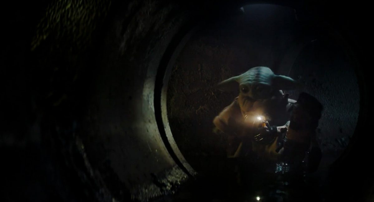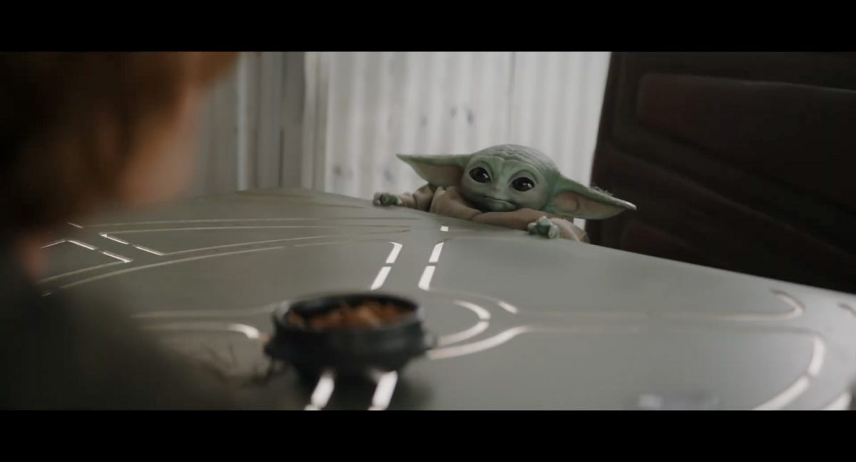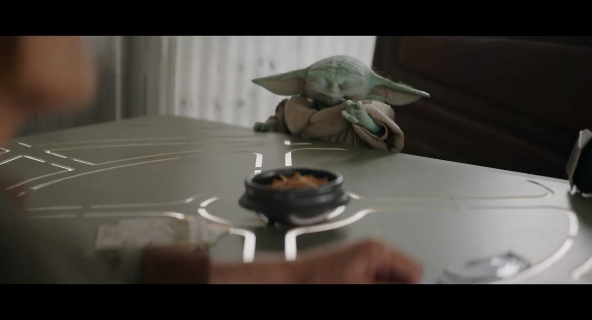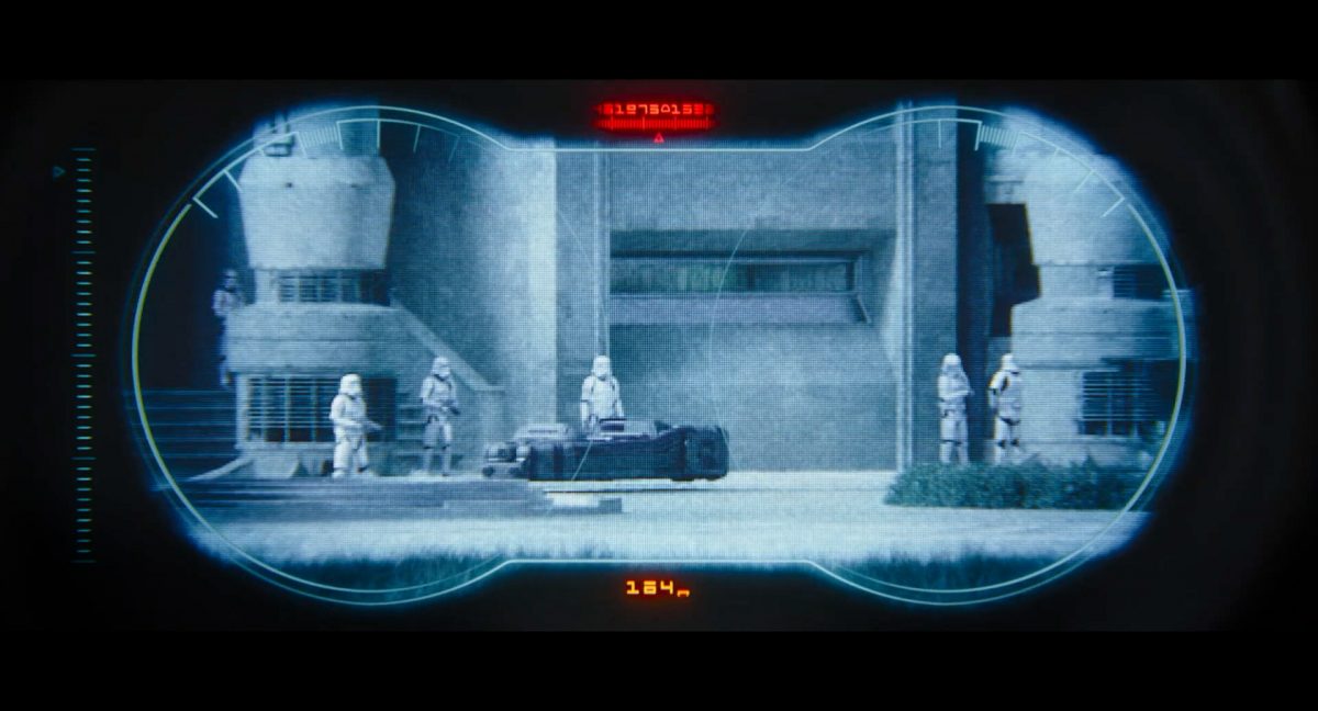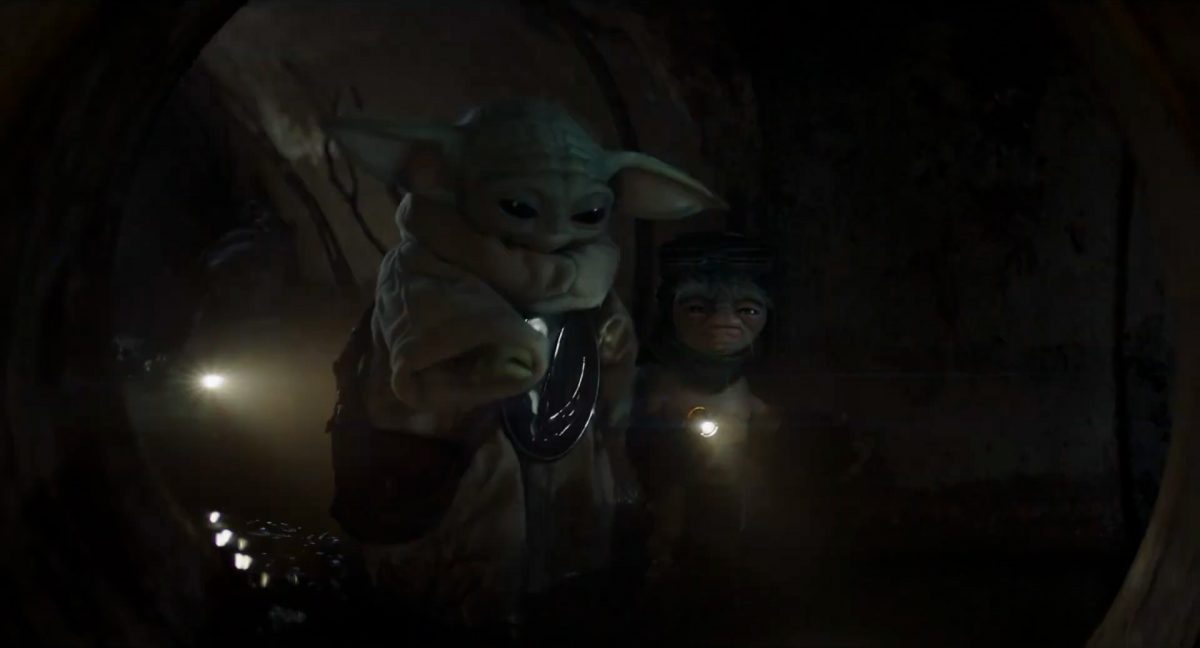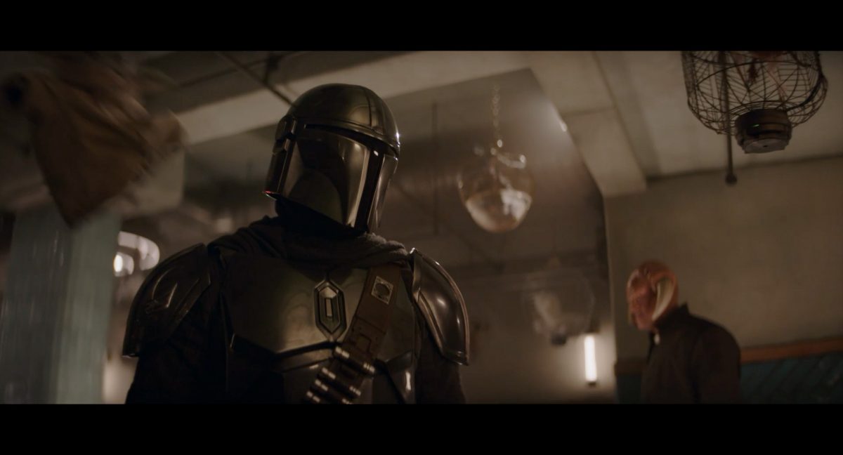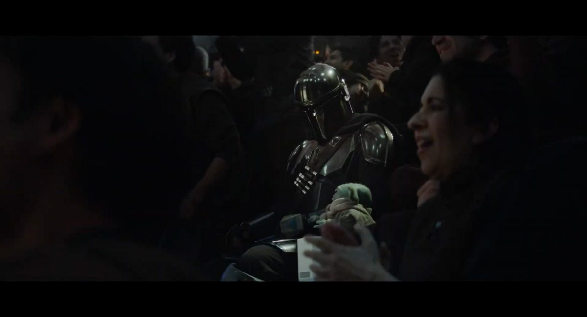 Der folgende Schnitt präsentiert, untermalt mit den anfänglichen zaghaften Tönen ihrer Titelmusik, den Mandalorianer Din Djarin (mutmaßlich dargestellt von Pedro Pascal) und seinen Adoptivsohn, den kleinen Grogu. Beide luken hinter eine Sanddüne hervor, verschwommen im Hintergrund sind sandige Hügel und ein Meer zu erkennen. Dabei benutzt Grogu offenbar ein abmontiertes Zielfernrohr als Fernglas.Klassische Makrofernglas-Optik; wer genau gerade hier durch das Visier schaut, bleibt uns vorerst verborgen. Allerdings scheint es sich der Gestaltung nach zu urteilen dabei nicht um das Visier zu handeln, welches Grogu gerade in der Hand hielt.Das Fernglas-Display hat einen schlichten holobläulichen Gesamtlook mit herausstechenden roten und gelben Zahlen-Anzeigen. Wir betrachten eine Gebäudestruktur, und als das Fernglas nach unten schwenkt, kommen mehrere Imperiale Sturmtruppler ins Bild, welche jenen Bau scheinbar am Haupttor, zu welchem eine breite, aber kurze Treppe hochführt, bewachen. Es hat den Anschein, dass ein kleiner rötlich gefärbter Speeder vor dem Gebäude steht. Überdies ist eine breite, abgerundete Säulen-Struktur vor dem Eingang angebracht.Eine weitere Schwarzblende, welcher sogleich eine Kameraperspektive in einem dunklen Tunnelnetzwerk folgt. Dort sehen wir aus einem Tunnel heraus, erleuchtet in einem schwachen Lichtkegel, die Gestalt eines kleinen Anzellaners (bekanntester Vertreter dieser Spezies ist Babu Frik aus Episode IX: Der Aufstieg Skywalkers), welcher mit einer kleinen Lampe in Richtung Kamera leuchtet. Es könnte sich dabei um einen derjenigen Anzellaner handeln, welche in der dritten Staffel bereits ihren Auftritt hatten.Nach einer Sekunde wendet er sich ab und bewegt nach rechts in den nächsten Tunnel.Noch bevor er ganz verschwunden ist, kommt hinter ihm von links Grogu ins Bild gelaufen.Er verlangsamt sein Tempo und blickt blinzelnd in unsere Richtung. Dann blendet das Bild erneut ab.Schnitt zum großen Co-Star des Films – Sigourney Weaver als Offizierin der Neuen Republik. Sie sitzt gerade, den Zuschauenden zugewandt, in der Messe der Adelphi-Basis an einem Tisch und studiert bei einer Tasse Was-auch-immer-frau-zu-dieser-Tageszeit-bei-der-Arbeit-trinkt ein Datenpad. Unter ihrem Jacken-Kragen kann man das Rangabzeichen mit den vier roten Punkten erkennen, was in dieser Anordnung auf einen Posten als Colonel hinweisen dürfte. Einen Namen für ihre Rolle haben wir zu diesem Zeitpunkt noch nicht.Als eine Gestalt – wir vermuten mal ganz stark den titelgebenden mandalorianischen Protagonisten – an sie herantritt, hebt sie den Blick, welcher uns leicht abschätzend vorkommt.Über Weavers Schulter hinweg sehen wir, wie der kleine grüne Freund des Mandos von unten an die Tischkante kommt und sich an dieser festhält. Auf dem Tisch mit einem Lichtornament verzierten metallischen Tisch ist eine Schale Cheerios oder ähnliches auszumachen.Die nächste Einstellung bestätigt uns unüberraschenderweise auch die Anwesenheit Dins bei diesem Treffen, der zu Grogus Linken Platz genommen hat. Das weiße Interieur der Basis-Messe ist im Hintergrund klar auszumachen, ebenso wie die kleine Schar anderer Gäste: Offizier- und Pilotenpersonal der Neuen Republik; letztere sind klar an ihren klassisch-orangefarbenen und blauen Flugmonturen zu erkennen. Zudem prangt das legendäre Symbol der einstigen Rebellenallianz klar und deutlich auf einem Banner.Grogu befindet sich mal wieder in einem Status der gastronomischen Selbstfindung und zieht mithilfe der Macht die Schüssel mit den Leckereien zu sich hin.Dieser Vorgang ist offenbar noch ein gewisser Kraftakt für ihn, der der Kleine kneift vor Konzentration die Kulleraugen zusammen, während die Schüssel stoßweise immer näherrückt.Sein Ziehvater nimmt den Vorgang schweigend zur Kenntnis. (Gleichzeitig kommt aufgrund ihrer Bewegungen der Verdacht auf, dass zwei der Piloten im Hintergrund eine Art von Tischkicker miteinander spielen.)Auch Colonel “Ellen Ripley” registriert den vorsätzlichen Akt des Mundraubs – ohne den Blick vom Mando abzuwenden, greift sie zur Seite und packt die Schüssel. In diesem Moment verhallt die Trailermusik.Ihren Snack fest im Griff wirft sie nun doch Grogu einen Blick zu.Dieser stellt seine Bemühungen umgehend ein und blick leicht traurig der Schüssel hinterher, welche Weavers Figur sogleich wieder in ihre Richtung zieht.Ein kauziger, aber unbestreitbar süßer Laut kommt ihm resigniert über die grünen Lippen.Mit dem unverkennbaren Mando-Sound als musikalische Untermalung kommt nun auch erstmals das chromatisierte Lucasfilm-Logo auf schwarzem Hintergrund ins Bild.Eine Stadtszenerie bei Nacht, diverse Neonschrift-Leuchten an Gebäuden … doch etwas ist verkehrt herum. Wir scheinen uns auf dem Kopf zu befinden …… denn wie wir feststellen, handelt es sich um eine Kameraeinstellung einer Pfütze, in welcher sich die Szenerie gespiegelt hat. In diesem Moment stampft ein Paar Stiefel durch eben jene Pfütze. Zu wem sie gehören, ist nicht klar ersichtlich.Das Innere einer Kantine oder sonstigen Etablissements. Ein Tisch mit abgerundeten Ecken und vier gepolsterten Stühlen, auf welchem noch ein paar Gläser ruhen befindet sich im Raum. Dahinter ist eine Bar auszumachen, mit einer roten Theke, deren dunkle Tischplatte scheinbar von unten beleuchtet wird. Eine oval geformte Auslassung in der graugrün gekachelten Wand beinhaltet mehrere Glasgefäße mit mutmaßlich verschiedenen Spirituosen.Im Vordergrund der Szene befindet sich Din Djarin, welcher sich gerade in einer Konfrontation mit einem Gegner befindet, den er sogleich mit einem heftigen Tritt in die Magengrube begegnet. Die fremde Gestalt wirkt einigermaßen humanoid und scheint eine Art hellbraunen Trenchcoat zu tragen.Einen schnellen Schnitt später fliegt eine Figur (auf den ersten Blick könnte es dieselbe sein, aber auf den zweiten wirkt es eher wie eine andere, denn die Kleidung wirkt vom Farbton etwas dunkler und and