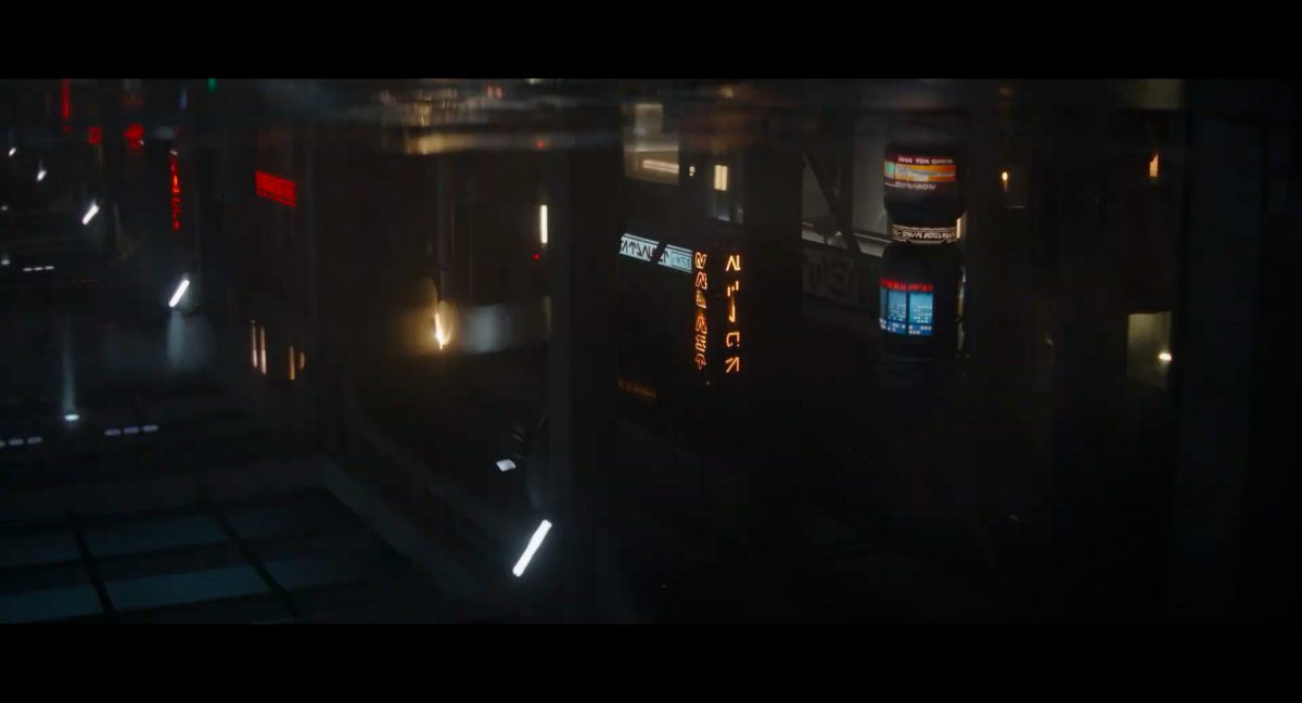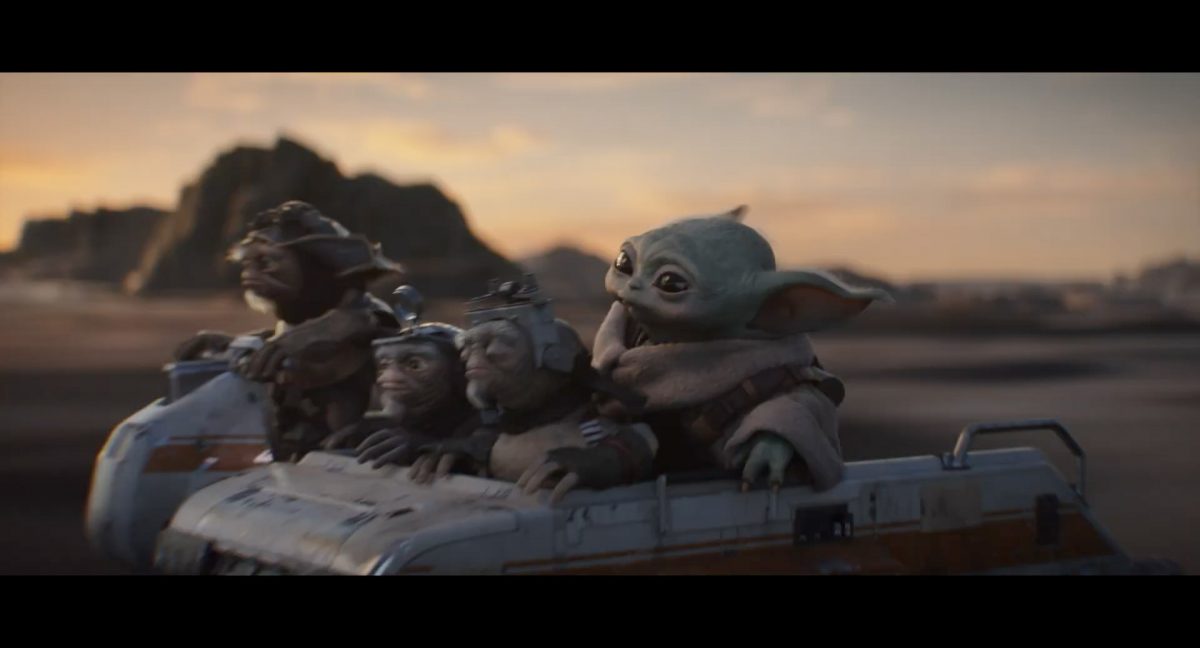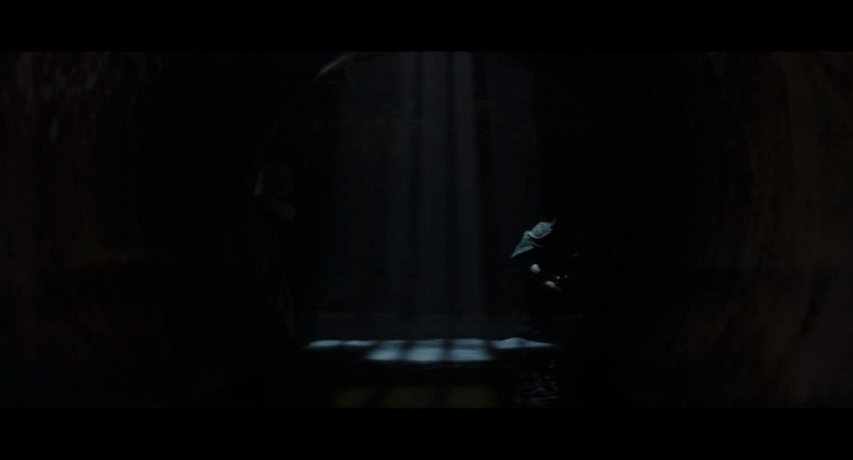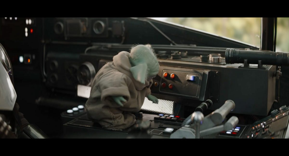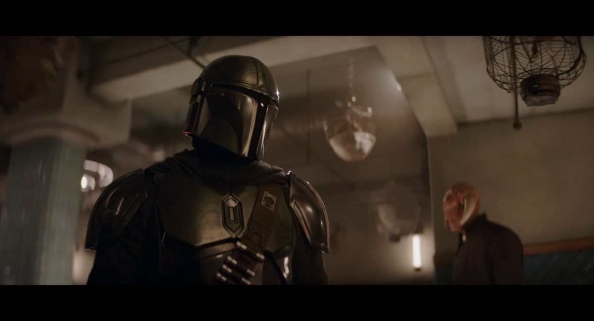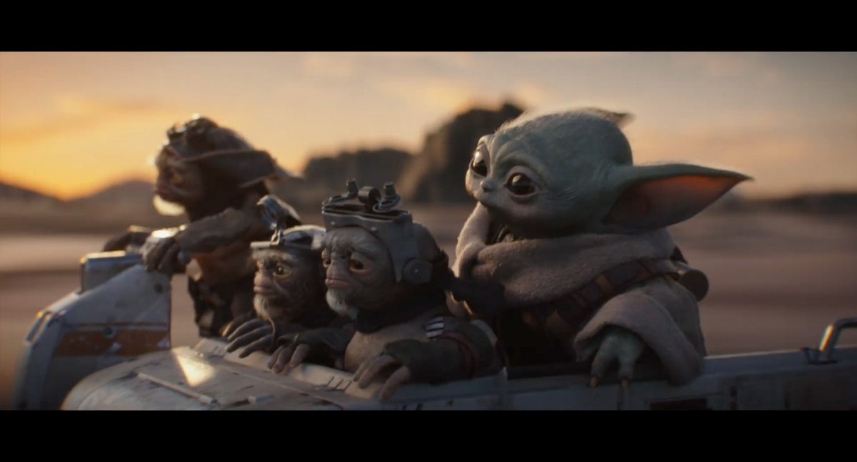 Der folgende Schnitt präsentiert, untermalt mit den anfänglichen zaghaften Tönen ihrer Titelmusik, den Mandalorianer Din Djarin (mutmaßlich dargestellt von Pedro Pascal) und seinen Adoptivsohn, den kleinen Grogu. Beide luken hinter eine Sanddüne hervor, verschwommen im Hintergrund sind sandige Hügel und ein Meer zu erkennen. Dabei benutzt Grogu offenbar ein abmontiertes Zielfernrohr als Fernglas.Klassische Makrofernglas-Optik; wer genau gerade hier durch das Visier schaut, bleibt uns vorerst verborgen. Allerdings scheint es sich der Gestaltung nach zu urteilen dabei nicht um das Visier zu handeln, welches Grogu gerade in der Hand hielt.Das Fernglas-Display hat einen schlichten holobläulichen Gesamtlook mit herausstechenden roten und gelben Zahlen-Anzeigen. Wir betrachten eine Gebäudestruktur, und als das Fernglas nach unten schwenkt, kommen mehrere Imperiale Sturmtruppler ins Bild, welche jenen Bau scheinbar am Haupttor, zu welchem eine breite, aber kurze Treppe hochführt, bewachen. Es hat den Anschein, dass ein kleiner rötlich gefärbter Speeder vor dem Gebäude steht. Überdies ist eine breite, abgerundete Säulen-Struktur vor dem Eingang angebracht.Eine weitere Schwarzblende, welcher sogleich eine Kameraperspektive in einem dunklen Tunnelnetzwerk folgt. Dort sehen wir aus einem Tunnel heraus, erleuchtet in einem schwachen Lichtkegel, die Gestalt eines kleinen Anzellaners (bekanntester Vertreter dieser Spezies ist Babu Frik aus Episode IX: Der Aufstieg Skywalkers), welcher mit einer kleinen Lampe in Richtung Kamera leuchtet. Es könnte sich dabei um einen derjenigen Anzellaner handeln, welche in der dritten Staffel bereits ihren Auftritt hatten.Nach einer Sekunde wendet er sich ab und bewegt nach rechts in den nächsten Tunnel.Noch bevor er ganz verschwunden ist, kommt hinter ihm von links Grogu ins Bild gelaufen.Er verlangsamt sein Tempo und blickt blinzelnd in unsere Richtung. Dann blendet das Bild erneut ab.Schnitt zum großen Co-Star des Films – Sigourney Weaver als Offizierin der Neuen Republik. Sie sitzt gerade, den Zuschauenden zugewandt, in der Messe der Adelphi-Basis an einem Tisch und studiert bei einer Tasse Was-auch-immer-frau-zu-dieser-Tageszeit-bei-der-Arbeit-trinkt ein Datenpad. Unter ihrem Jacken-Kragen kann man das Rangabzeichen mit den vier roten Punkten erkennen, was in dieser Anordnung auf einen Posten als Colonel hinweisen dürfte. Einen Namen für ihre Rolle haben wir zu diesem Zeitpunkt noch nicht.Als eine Gestalt – wir vermuten mal ganz stark den titelgebenden mandalorianischen Protagonisten – an sie herantritt, hebt sie den Blick, welcher uns leicht abschätzend vorkommt.Über Weavers Schulter hinweg sehen wir, wie der kleine grüne Freund des Mandos von unten an die Tischkante kommt und sich an dieser festhält. Auf dem Tisch mit einem Lichtornament verzierten metallischen Tisch ist eine Schale Cheerios oder ähnliches auszumachen.Die nächste Einstellung bestätigt uns unüberraschenderweise auch die Anwesenheit Dins bei diesem Treffen, der zu Grogus Linken Platz genommen hat. Das weiße Interieur der Basis-Messe ist im Hintergrund klar auszumachen, ebenso wie die kleine Schar anderer Gäste: Offizier- und Pilotenpersonal der Neuen Republik; letztere sind klar an ihren klassisch-orangefarbenen und blauen Flugmonturen zu erkennen. Zudem prangt das legendäre Symbol der einstigen Rebellenallianz klar und deutlich auf einem Banner.Grogu befindet sich mal wieder in einem Status der gastronomischen Selbstfindung und zieht mithilfe der Macht die Schüssel mit den Leckereien zu sich hin.Dieser Vorgang ist offenbar noch ein gewisser Kraftakt für ihn, der der Kleine kneift vor Konzentration die Kulleraugen zusammen, während die Schüssel stoßweise immer näherrückt.Sein Ziehvater nimmt den Vorgang schweigend zur Kenntnis. (Gleichzeitig kommt aufgrund ihrer Bewegungen der Verdacht auf, dass zwei der Piloten im Hintergrund eine Art von Tischkicker miteinander spielen.)Auch Colonel “Ellen Ripley” registriert den vorsätzlichen Akt des Mundraubs – ohne den Blick vom Mando abzuwenden, greift sie zur Seite und packt die Schüssel. In diesem Moment verhallt die Trailermusik.Ihren Snack fest im Griff wirft sie nun doch Grogu einen Blick zu.Dieser stellt seine Bemühungen umgehend ein und blick leicht traurig der Schüssel hinterher, welche Weavers Figur sogleich wieder in ihre Richtung zieht.Ein kauziger, aber unbestreitbar süßer Laut kommt ihm resigniert über die grünen Lippen.Mit dem unverkennbaren Mando-Sound als musikalische Untermalung kommt nun auch erstmals das chromatisierte Lucasfilm-Logo auf schwarzem Hintergrund ins Bild.Eine Stadtszenerie bei Nacht, diverse Neonschrift-Leuchten an Gebäuden … doch etwas ist verkehrt herum. Wir scheinen uns auf dem Kopf zu befinden …… denn wie wir feststellen, handelt es sich um eine Kameraeinstellung einer Pfütze, in welcher sich die Szenerie gespiegelt hat. In diesem Moment stampft ein Paar Stiefel durch eben jene Pfütze. Zu wem sie gehören, ist nicht klar ersichtlich.Das Innere einer Kantine oder sonstigen Etablissements. Ein Tisch mit abgerundeten Ecken und vier gepolsterten Stühlen, auf welchem noch ein paar Gläser ruhen befindet sich im Raum. Dahinter ist eine Bar auszumachen, mit einer roten Theke, deren dunkle Tischplatte scheinbar von unten beleuchtet wird. Eine oval geformte Auslassung in der graugrün gekachelten Wand beinhaltet mehrere Glasgefäße mit mutmaßlich verschiedenen Spirituosen.Im Vordergrund der Szene befindet sich Din Djarin, welcher sich gerade in einer Konfrontation mit einem Gegner befindet, den er sogleich mit einem heftigen Tritt in die Magengrube begegnet. Die fremde Gestalt wirkt einigermaßen humanoid und scheint eine Art hellbraunen Trenchcoat zu tragen.Einen schnellen Schnitt später fliegt eine Figur (auf den ersten Blick könnte es dieselbe sein, aber auf den zweiten wirkt es eher wie eine andere, denn die Kleidung wirkt vom Farbton etwas dunkler und and