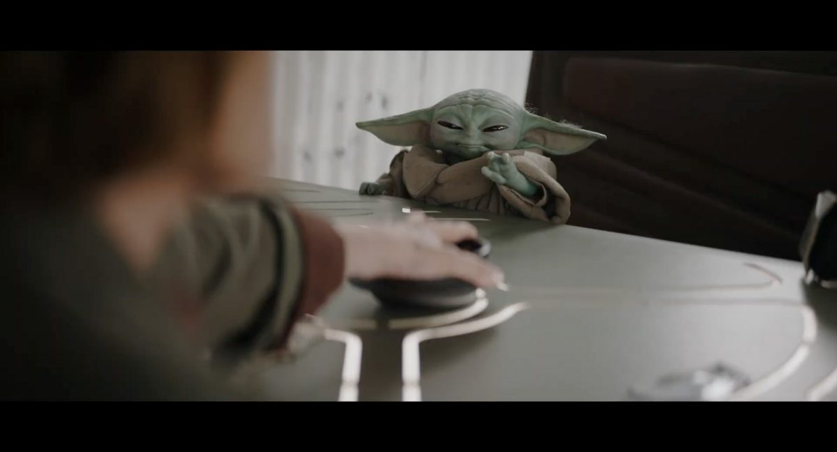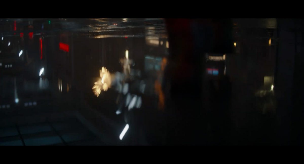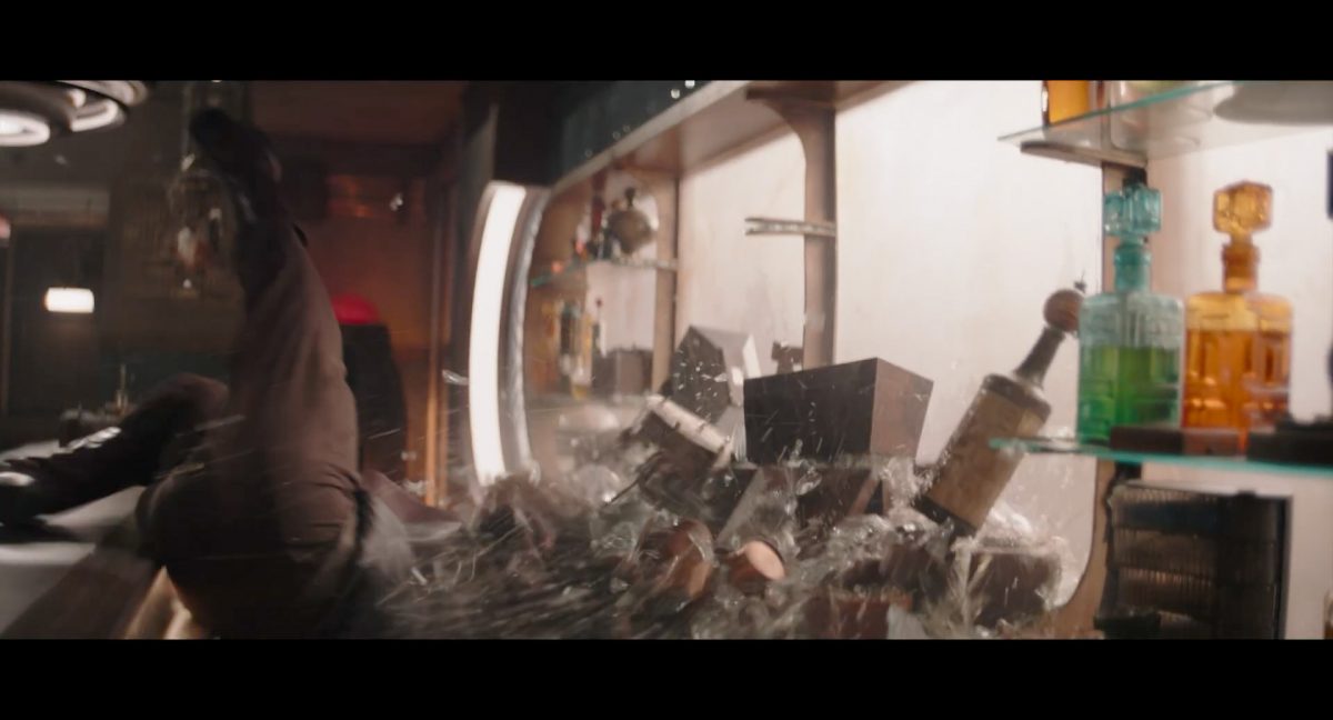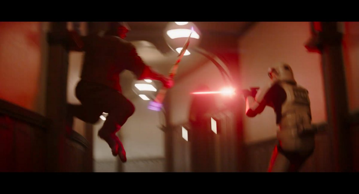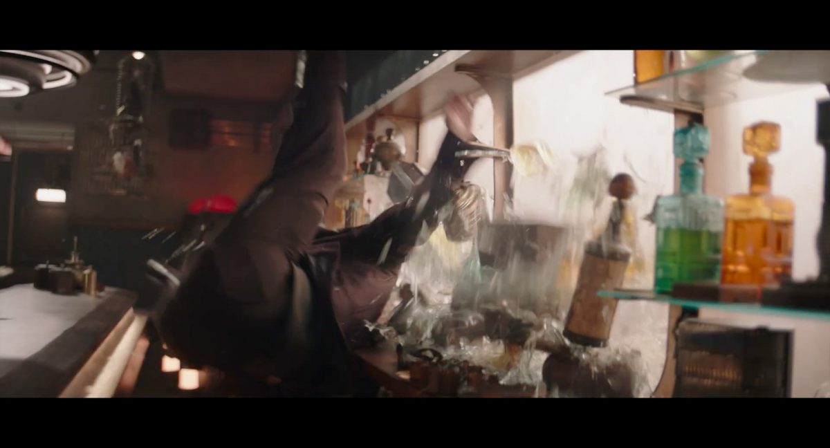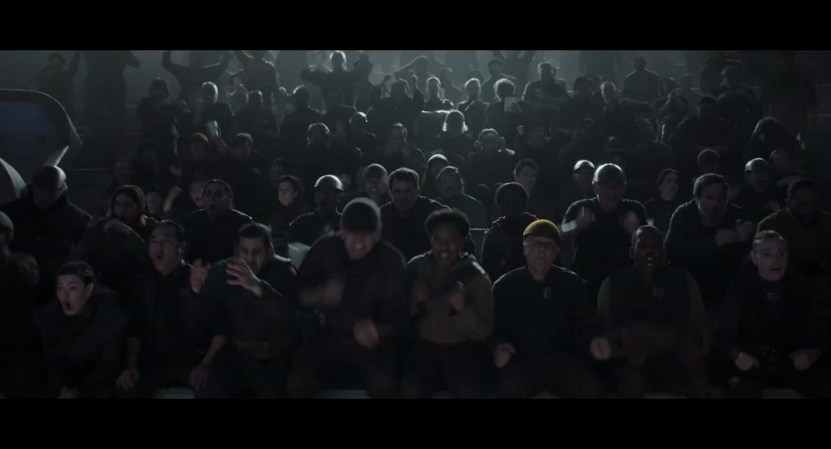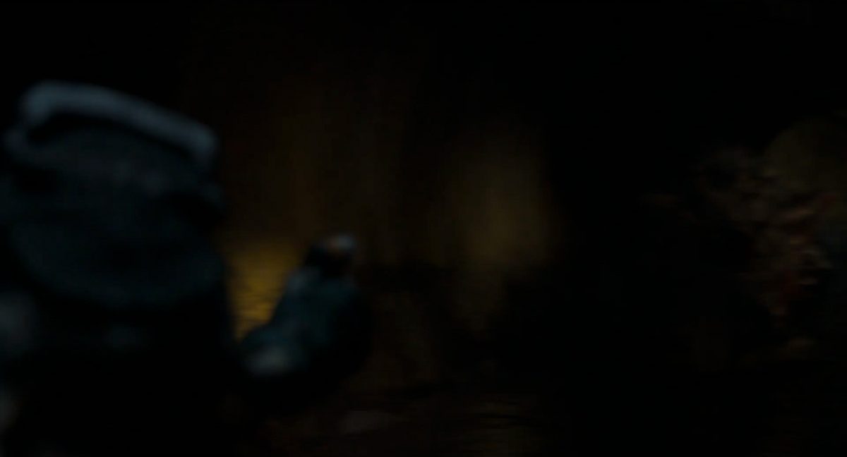 Der folgende Schnitt präsentiert, untermalt mit den anfänglichen zaghaften Tönen ihrer Titelmusik, den Mandalorianer Din Djarin (mutmaßlich dargestellt von Pedro Pascal) und seinen Adoptivsohn, den kleinen Grogu. Beide luken hinter eine Sanddüne hervor, verschwommen im Hintergrund sind sandige Hügel und ein Meer zu erkennen. Dabei benutzt Grogu offenbar ein abmontiertes Zielfernrohr als Fernglas.Klassische Makrofernglas-Optik; wer genau gerade hier durch das Visier schaut, bleibt uns vorerst verborgen. Allerdings scheint es sich der Gestaltung nach zu urteilen dabei nicht um das Visier zu handeln, welches Grogu gerade in der Hand hielt.Das Fernglas-Display hat einen schlichten holobläulichen Gesamtlook mit herausstechenden roten und gelben Zahlen-Anzeigen. Wir betrachten eine Gebäudestruktur, und als das Fernglas nach unten schwenkt, kommen mehrere Imperiale Sturmtruppler ins Bild, welche jenen Bau scheinbar am Haupttor, zu welchem eine breite, aber kurze Treppe hochführt, bewachen. Es hat den Anschein, dass ein kleiner rötlich gefärbter Speeder vor dem Gebäude steht. Überdies ist eine breite, abgerundete Säulen-Struktur vor dem Eingang angebracht.Eine weitere Schwarzblende, welcher sogleich eine Kameraperspektive in einem dunklen Tunnelnetzwerk folgt. Dort sehen wir aus einem Tunnel heraus, erleuchtet in einem schwachen Lichtkegel, die Gestalt eines kleinen Anzellaners (bekanntester Vertreter dieser Spezies ist Babu Frik aus Episode IX: Der Aufstieg Skywalkers), welcher mit einer kleinen Lampe in Richtung Kamera leuchtet. Es könnte sich dabei um einen derjenigen Anzellaner handeln, welche in der dritten Staffel bereits ihren Auftritt hatten.Nach einer Sekunde wendet er sich ab und bewegt nach rechts in den nächsten Tunnel.Noch bevor er ganz verschwunden ist, kommt hinter ihm von links Grogu ins Bild gelaufen.Er verlangsamt sein Tempo und blickt blinzelnd in unsere Richtung. Dann blendet das Bild erneut ab.Schnitt zum großen Co-Star des Films – Sigourney Weaver als Offizierin der Neuen Republik. Sie sitzt gerade, den Zuschauenden zugewandt, in der Messe der Adelphi-Basis an einem Tisch und studiert bei einer Tasse Was-auch-immer-frau-zu-dieser-Tageszeit-bei-der-Arbeit-trinkt ein Datenpad. Unter ihrem Jacken-Kragen kann man das Rangabzeichen mit den vier roten Punkten erkennen, was in dieser Anordnung auf einen Posten als Colonel hinweisen dürfte. Einen Namen für ihre Rolle haben wir zu diesem Zeitpunkt noch nicht.Als eine Gestalt – wir vermuten mal ganz stark den titelgebenden mandalorianischen Protagonisten – an sie herantritt, hebt sie den Blick, welcher uns leicht abschätzend vorkommt.Über Weavers Schulter hinweg sehen wir, wie der kleine grüne Freund des Mandos von unten an die Tischkante kommt und sich an dieser festhält. Auf dem Tisch mit einem Lichtornament verzierten metallischen Tisch ist eine Schale Cheerios oder ähnliches auszumachen.Die nächste Einstellung bestätigt uns unüberraschenderweise auch die Anwesenheit Dins bei diesem Treffen, der zu Grogus Linken Platz genommen hat. Das weiße Interieur der Basis-Messe ist im Hintergrund klar auszumachen, ebenso wie die kleine Schar anderer Gäste: Offizier- und Pilotenpersonal der Neuen Republik; letztere sind klar an ihren klassisch-orangefarbenen und blauen Flugmonturen zu erkennen. Zudem prangt das legendäre Symbol der einstigen Rebellenallianz klar und deutlich auf einem Banner.Grogu befindet sich mal wieder in einem Status der gastronomischen Selbstfindung und zieht mithilfe der Macht die Schüssel mit den Leckereien zu sich hin.Dieser Vorgang ist offenbar noch ein gewisser Kraftakt für ihn, der der Kleine kneift vor Konzentration die Kulleraugen zusammen, während die Schüssel stoßweise immer näherrückt.Sein Ziehvater nimmt den Vorgang schweigend zur Kenntnis. (Gleichzeitig kommt aufgrund ihrer Bewegungen der Verdacht auf, dass zwei der Piloten im Hintergrund eine Art von Tischkicker miteinander spielen.)Auch Colonel “Ellen Ripley” registriert den vorsätzlichen Akt des Mundraubs – ohne den Blick vom Mando abzuwenden, greift sie zur Seite und packt die Schüssel. In diesem Moment verhallt die Trailermusik.Ihren Snack fest im Griff wirft sie nun doch Grogu einen Blick zu.Dieser stellt seine Bemühungen umgehend ein und blick leicht traurig der Schüssel hinterher, welche Weavers Figur sogleich wieder in ihre Richtung zieht.Ein kauziger, aber unbestreitbar süßer Laut kommt ihm resigniert über die grünen Lippen.Mit dem unverkennbaren Mando-Sound als musikalische Untermalung kommt nun auch erstmals das chromatisierte Lucasfilm-Logo auf schwarzem Hintergrund ins Bild.Eine Stadtszenerie bei Nacht, diverse Neonschrift-Leuchten an Gebäuden … doch etwas ist verkehrt herum. Wir scheinen uns auf dem Kopf zu befinden …… denn wie wir feststellen, handelt es sich um eine Kameraeinstellung einer Pfütze, in welcher sich die Szenerie gespiegelt hat. In diesem Moment stampft ein Paar Stiefel durch eben jene Pfütze. Zu wem sie gehören, ist nicht klar ersichtlich.Das Innere einer Kantine oder sonstigen Etablissements. Ein Tisch mit abgerundeten Ecken und vier gepolsterten Stühlen, auf welchem noch ein paar Gläser ruhen befindet sich im Raum. Dahinter ist eine Bar auszumachen, mit einer roten Theke, deren dunkle Tischplatte scheinbar von unten beleuchtet wird. Eine oval geformte Auslassung in der graugrün gekachelten Wand beinhaltet mehrere Glasgefäße mit mutmaßlich verschiedenen Spirituosen.Im Vordergrund der Szene befindet sich Din Djarin, welcher sich gerade in einer Konfrontation mit einem Gegner befindet, den er sogleich mit einem heftigen Tritt in die Magengrube begegnet. Die fremde Gestalt wirkt einigermaßen humanoid und scheint eine Art hellbraunen Trenchcoat zu tragen.Einen schnellen Schnitt später fliegt eine Figur (auf den ersten Blick könnte es dieselbe sein, aber auf den zweiten wirkt es eher wie eine andere, denn die Kleidung wirkt vom Farbton etwas dunkler und and
