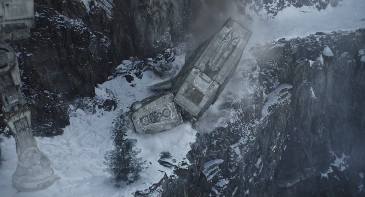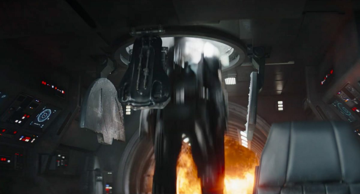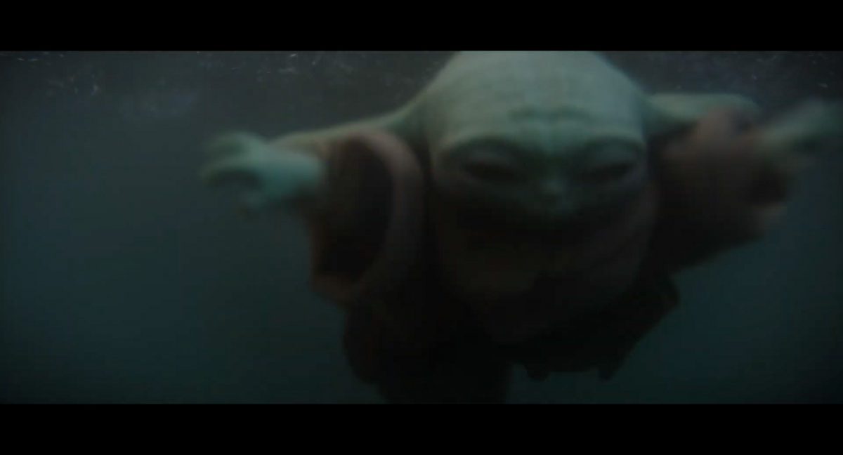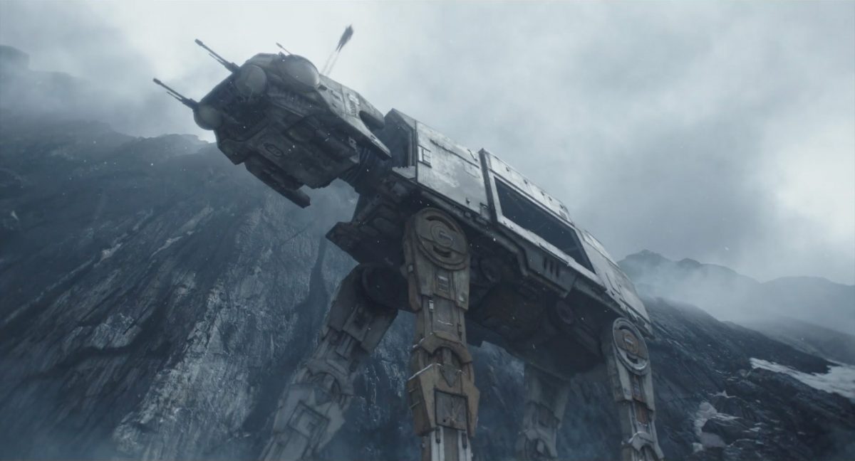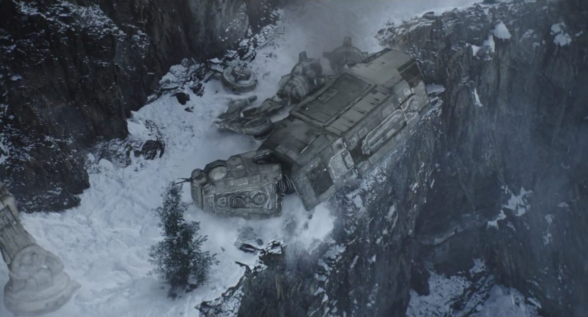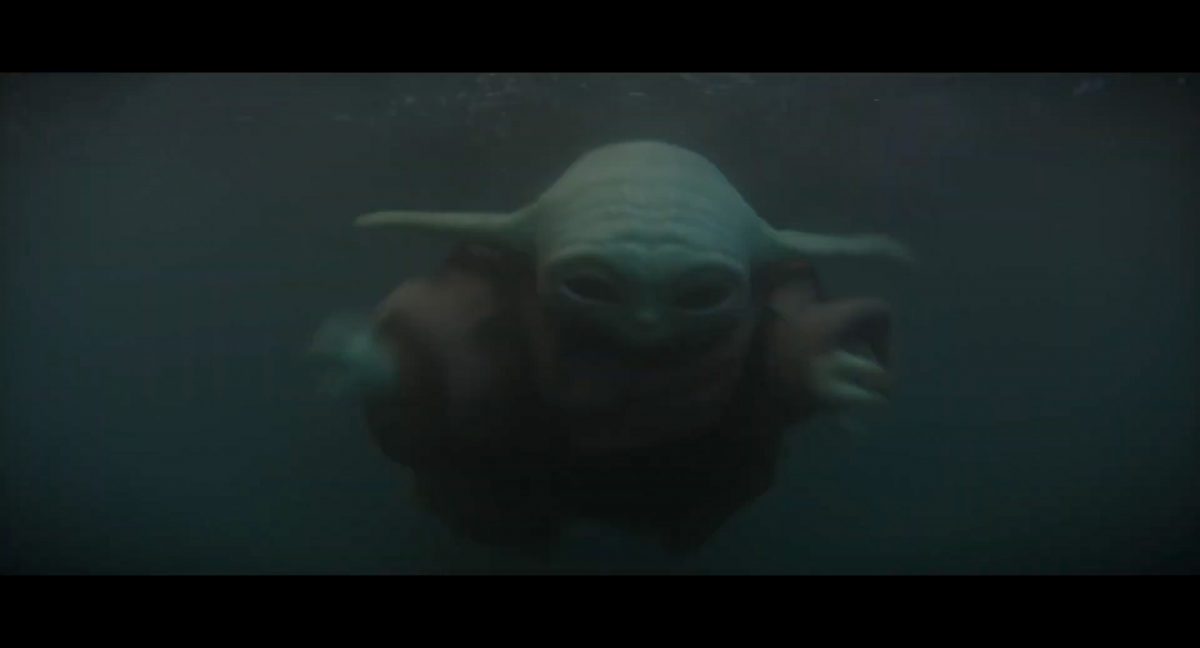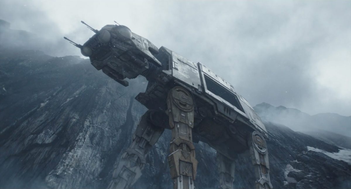 “… der Weg.”Din samt Grogu im Huckepack im Inneren des Cockpits eines AT-AT-Kampfläufers. Über ihnen sehen wir eine geöffnete Dachluke; hinter ihnen bahnt sich gerade eine Explosion ihren Weg aus dem Haupt-Korpus ins Cockpit. Wir sehen wohl das Ende der auf der Celebration Japan gezeigten Ausschnitts, in welchem Din den Kampfläufer entert und dabei mehrere Schneetruppler ausschaltet.Der Mando geht in die Knie, als wolle er zum Sprung ansetzen …… und fliegt gerade nach oben durch die geöffnete Luke, gerade bevor die Flammen ihn erreichen.Außenansicht aus der Froschperspektive auf den Imperialen Kampfläufer, der eine relativ glatte, hohe Felswand unter einem Wolken- oder Nebelverhangenen Himmel entlang schreitet. Das geübte Auge erkennt bereits, dass es sich hierbei um die Proto-Version des AT-AT handelt, wie sie noch in Star Wars Rebels oder Jedi: Fallen Order zu sehen waren. Außerdem scheint die große Seitenluke geöffnet zu sein.Der Umriss des davonfliegenden Mandos samt Grogu, wie er vom Kopf aus in den Himmel steigt.Als Nächstes wird der AT-AT von der Explosion innerlich fast auseinandergerissen, als Feuer aus den Seitenluken austritt.Abgestimmt auf den Takt der Melodie fressen sich die Flammen der Explosionen durch das zerfetzte Metall.Ein Cut und wir sehen einen AT-AT desselben Modells aus ein wenig größerer Entfernung, welcher hinter einem weiteren dahin schreitet. Seinem äußerlichen Zustand und der Abstinenz jeglichen Feuers und Rauches nach zu urteilen handelt es sich dabei nicht um den gleichen Läufer, der soeben explodiert ist. Dieser hier geht aus noch nicht geklärter Ursache heraus in die Knie und fällt vorne über.Man erkennt etwas mehr von der Umgebung … wir befinden uns auf einem recht schmalen Pfad, welchen die Kampfläufer offenkundig entlang marschieren. Vereinzelte Tannen sind auszumachen und die gesamte Gegend ist recht verschneit; der Eindruck, dass wir uns hoch oben in einem Gebirge befinden, liegt nahe. Eine gewisse Ähnlichkeit mit dem Planeten Vandor, wo Han & Chewie zusammen mit Tobias Beckett einen Coup gegen einen Imperialen Zugtransport in den Bergen durchführten, lässt sich nicht bestreiten.Fast schon gemächlich schlägt der AT-AT Stück für Stück auf dem harten Steinboden auf …… und kippt zur Seite, von der Schwerkraft unwiderstehlich in den Abhang gezogen. Dabei ist zu erkennen, dass sich sein vorderer rechter Fuß anscheinend vom Bein getrennt hat.Eine Perspektive von weiter weg offenbart uns, dass zwei AT-AT-Kampfläufer vor dem dritten dahin schreiten. Diese marschieren auch fleißig weiter, möglicherweise haben die Besatzungen nichts von dem Schicksal des dritten Gefährtes mitbekommen.Leise rieselt der Schnee … und der Stein … und der Kampfläufer.Star Wars: The Mandalorian and Grogu im neuen Schriftzug.Nur im Kino.Erneuter Zyklopen-Alarm …Ein einäugiges Ratten-ähnliches Vieh mit vorstehenden Hauern, großen Ohren und kleinen Hörnern kommt zum Vorschein.Es brüllt und zeigt sein gefletschtes Maul samt ordentlichen Speichelfäden.Diese Geste gilt Grogu und den Anzellanern, die sich vermutlich in dem Tunnelnetzwerk befinden, in welchem wir sie vorhin sahen.Als Reaktion auf diesen unbegründeten Ausdruck der Aggressivität hebt Grogu den Arm und feuert aus dem Ärmel einen Tropfen grünes Etwas auf das Ungetüm.Das grüne Etwas trifft spritzend mitten ins Ziel: das Auge des Geschöpfes. “Bullseye” sagt der Fachmann dazu.Die Kreatur reagiert eher ungehalten auf den Beschuss seines Sehorgans.Wie wir im Gegensatz zu der Zyklopenratte sehen können, ist sein Auge mit einer schlickgrünen Substanz verklebt.Es windet sich empört und schüttelt sich im Wasser des Kanalrohrs.Der Anzellaner kommentiert das Geschehen wohlwollend:“Good shot, baby.” “Guter Schuss, Baby.”Die beiden setzen ihren Weg durch einen anderen Tunnel fort.Mai 2026 auf der großen Leinwand …