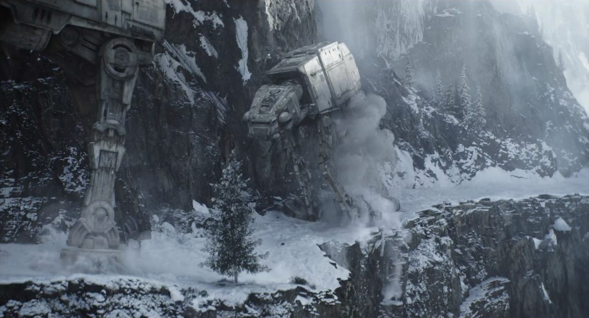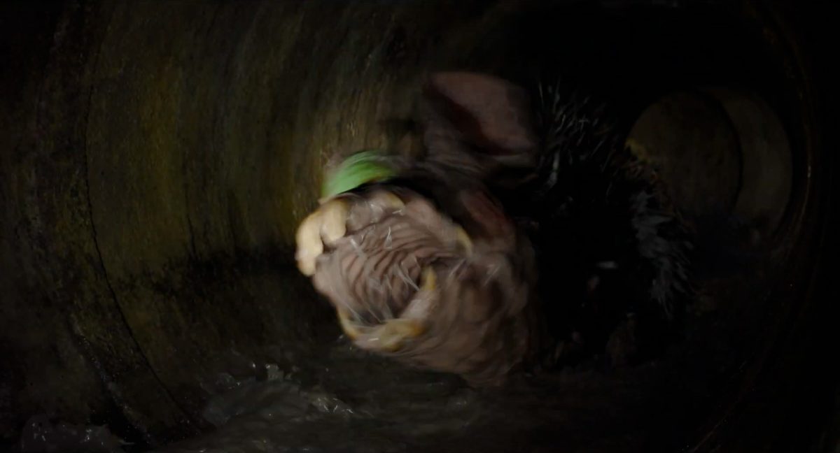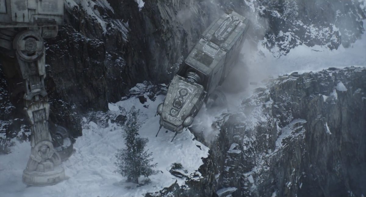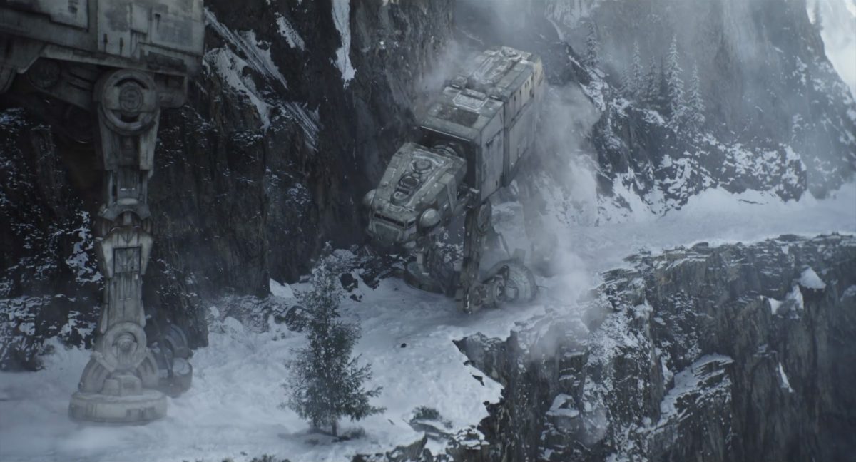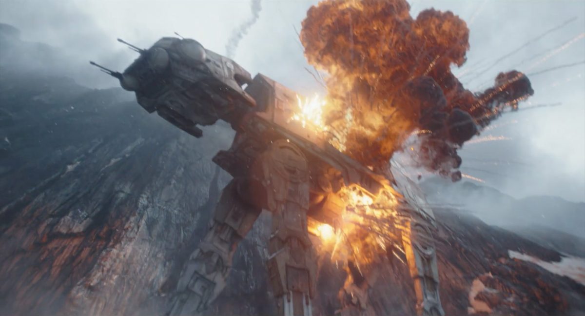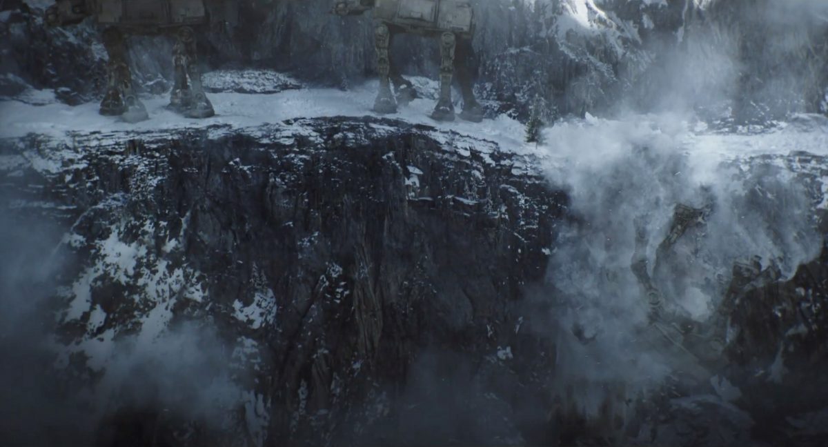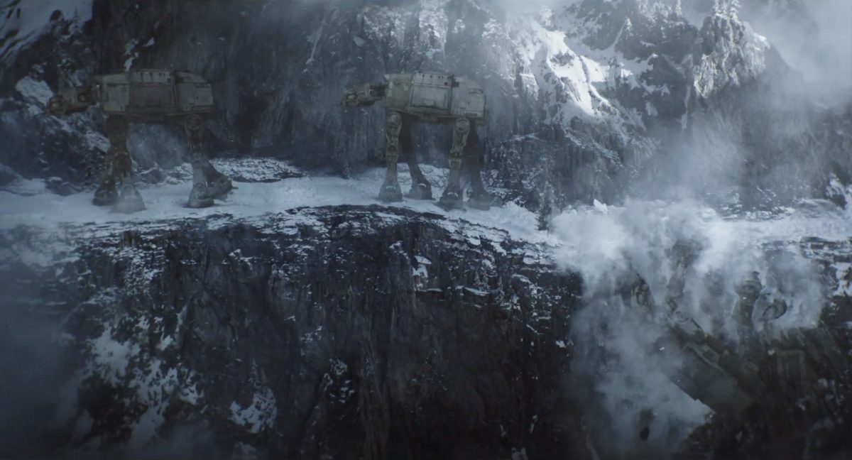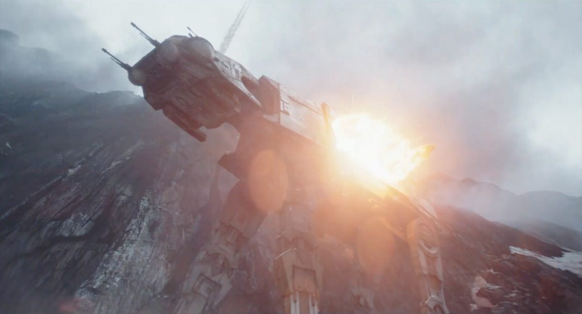 “… der Weg.”Din samt Grogu im Huckepack im Inneren des Cockpits eines AT-AT-Kampfläufers. Über ihnen sehen wir eine geöffnete Dachluke; hinter ihnen bahnt sich gerade eine Explosion ihren Weg aus dem Haupt-Korpus ins Cockpit. Wir sehen wohl das Ende der auf der Celebration Japan gezeigten Ausschnitts, in welchem Din den Kampfläufer entert und dabei mehrere Schneetruppler ausschaltet.Der Mando geht in die Knie, als wolle er zum Sprung ansetzen …… und fliegt gerade nach oben durch die geöffnete Luke, gerade bevor die Flammen ihn erreichen.Außenansicht aus der Froschperspektive auf den Imperialen Kampfläufer, der eine relativ glatte, hohe Felswand unter einem Wolken- oder Nebelverhangenen Himmel entlang schreitet. Das geübte Auge erkennt bereits, dass es sich hierbei um die Proto-Version des AT-AT handelt, wie sie noch in Star Wars Rebels oder Jedi: Fallen Order zu sehen waren. Außerdem scheint die große Seitenluke geöffnet zu sein.Der Umriss des davonfliegenden Mandos samt Grogu, wie er vom Kopf aus in den Himmel steigt.Als Nächstes wird der AT-AT von der Explosion innerlich fast auseinandergerissen, als Feuer aus den Seitenluken austritt.Abgestimmt auf den Takt der Melodie fressen sich die Flammen der Explosionen durch das zerfetzte Metall.Ein Cut und wir sehen einen AT-AT desselben Modells aus ein wenig größerer Entfernung, welcher hinter einem weiteren dahin schreitet. Seinem äußerlichen Zustand und der Abstinenz jeglichen Feuers und Rauches nach zu urteilen handelt es sich dabei nicht um den gleichen Läufer, der soeben explodiert ist. Dieser hier geht aus noch nicht geklärter Ursache heraus in die Knie und fällt vorne über.Man erkennt etwas mehr von der Umgebung … wir befinden uns auf einem recht schmalen Pfad, welchen die Kampfläufer offenkundig entlang marschieren. Vereinzelte Tannen sind auszumachen und die gesamte Gegend ist recht verschneit; der Eindruck, dass wir uns hoch oben in einem Gebirge befinden, liegt nahe. Eine gewisse Ähnlichkeit mit dem Planeten Vandor, wo Han & Chewie zusammen mit Tobias Beckett einen Coup gegen einen Imperialen Zugtransport in den Bergen durchführten, lässt sich nicht bestreiten.Fast schon gemächlich schlägt der AT-AT Stück für Stück auf dem harten Steinboden auf …… und kippt zur Seite, von der Schwerkraft unwiderstehlich in den Abhang gezogen. Dabei ist zu erkennen, dass sich sein vorderer rechter Fuß anscheinend vom Bein getrennt hat.Eine Perspektive von weiter weg offenbart uns, dass zwei AT-AT-Kampfläufer vor dem dritten dahin schreiten. Diese marschieren auch fleißig weiter, möglicherweise haben die Besatzungen nichts von dem Schicksal des dritten Gefährtes mitbekommen.Leise rieselt der Schnee … und der Stein … und der Kampfläufer.Star Wars: The Mandalorian and Grogu im neuen Schriftzug.Nur im Kino.Erneuter Zyklopen-Alarm …Ein einäugiges Ratten-ähnliches Vieh mit vorstehenden Hauern, großen Ohren und kleinen Hörnern kommt zum Vorschein.Es brüllt und zeigt sein gefletschtes Maul samt ordentlichen Speichelfäden.Diese Geste gilt Grogu und den Anzellanern, die sich vermutlich in dem Tunnelnetzwerk befinden, in welchem wir sie vorhin sahen.Als Reaktion auf diesen unbegründeten Ausdruck der Aggressivität hebt Grogu den Arm und feuert aus dem Ärmel einen Tropfen grünes Etwas auf das Ungetüm.Das grüne Etwas trifft spritzend mitten ins Ziel: das Auge des Geschöpfes. “Bullseye” sagt der Fachmann dazu.Die Kreatur reagiert eher ungehalten auf den Beschuss seines Sehorgans.Wie wir im Gegensatz zu der Zyklopenratte sehen können, ist sein Auge mit einer schlickgrünen Substanz verklebt.Es windet sich empört und schüttelt sich im Wasser des Kanalrohrs.Der Anzellaner kommentiert das Geschehen wohlwollend:“Good shot, baby.” “Guter Schuss, Baby.”Die beiden setzen ihren Weg durch einen anderen Tunnel fort.Mai 2026 auf der großen Leinwand …