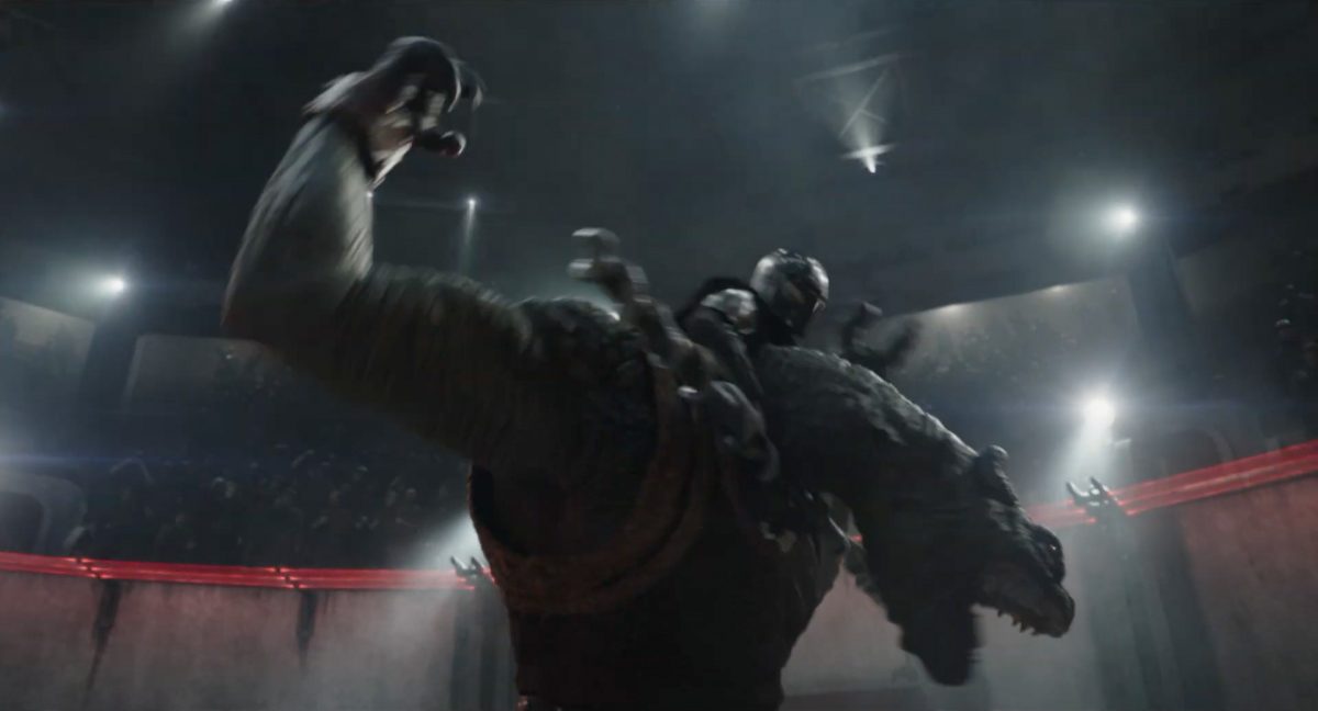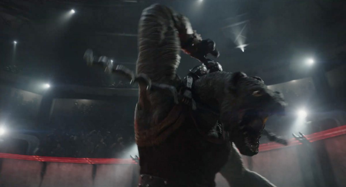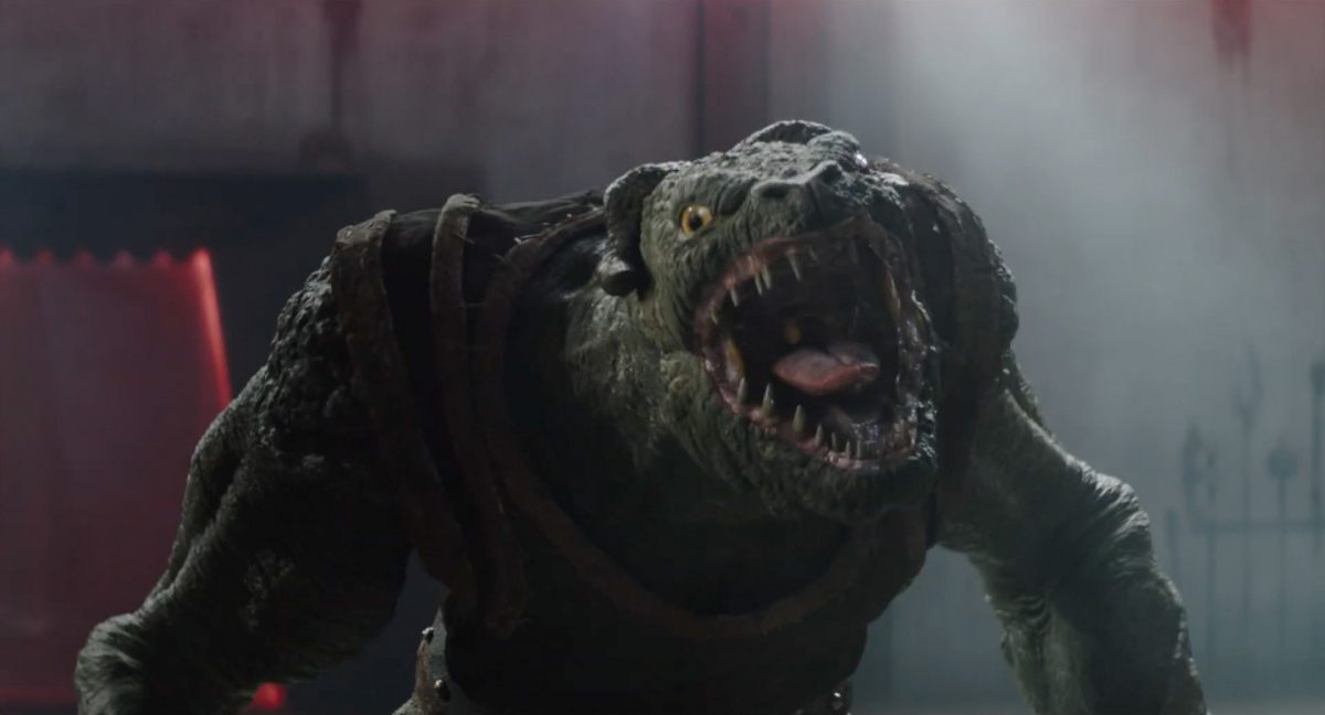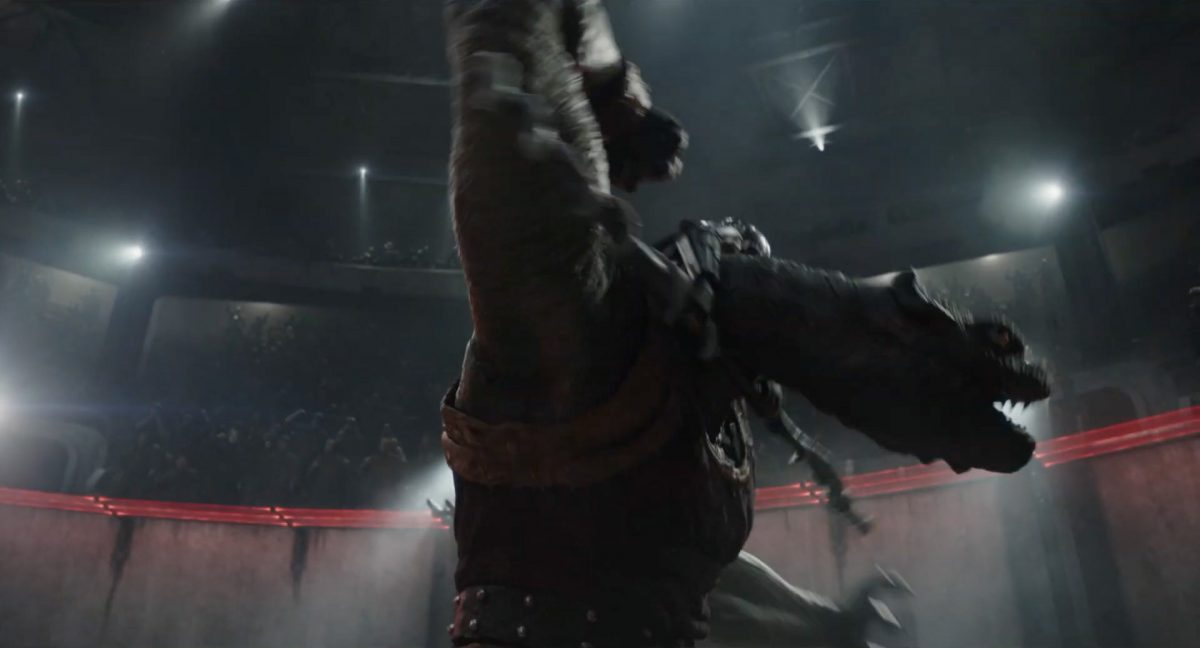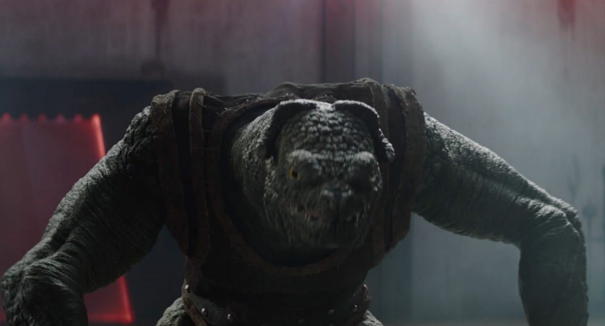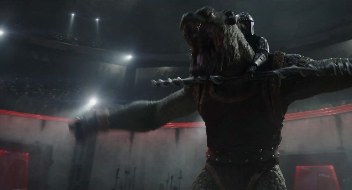 Der Blasterbolzen verfehlt den vorwärts stürmenden Mandalorianer und schlägt unter grellen, alles erleuchtenden Funken im Boden ein.Din geht auf der anderen Seite sogleich hinter einem abgerundetem Rahmen in Deckung, sein Desintegrationsgewehr im Anschlag …… während der breitbeinige Zyklopen-Droide in Stellung tritt und seinen Handgelenksblaster wieder feuerbereit macht. Zugleich kommt auch der zweite Wächter an der Seite ins Bild.Als er anlegt, feuert Din einen gelblichen Blasterbolzen aus seinem Gewehr in die Hüftgegend seines größentechnisch überlegenen metallischen Gegners ab.Der Schuss trifft zwar, scheint aber keinen unmittelbaren Effekt zu erzielen.“ … ist …”Wir blicken in das brüllende Antlitz eines mantellianischen Savrips. Diese Spezies kennt man vor allem als Spielfigur aus dem Holo-Dejarik-Spiel, welches erstmals in Episode IV: Eine neue Hoffnung an Bord des Millenium Falken gezeigt wurde.Er steht vor einem Tor mit rötlicher Laserfeld-Barriere und wird halb von einem Scheinwerfer beleuchtet, was den Verdacht nahelegt, dass wir uns in der Arena befinden, in welcher wir eben noch Rotta gesehen haben.Die folgende Einstellung bestätigt diesen Verdacht. Doch nicht der Hutte befindet sich im Kampf mit dem Savrip, sondern Din.Dieser klammert sich an eine Stange mit drumherum gewundenem Element (vielleicht eine zeremionelle Waffe?) vor dem Hals der tobenden Kreatur und kann sich so auf deren Rücken halten. Ein Blick fürs Detail offenbart, dass an der Wand der Rotunde weitere Speer-artige Nahkampfwaffen aufgestellt und zur allgemeinen Verfügung bereitstehen.Der Savrip versucht, des mandalorianischen Ärgernisses auf seinem Rücken habhaft zu werden, doch viele von uns werden das Problem kennen: Man erreicht einfach nicht die richtige Stelle, um sich da mal ordentlich zu kratzen, wo es dringend nötig wäre.Der Belustigung der Menge scheint dies keinen Abbruch zu tun.Die Vollendung der Texteinblendung und des gängigen Zitats aus der Serie: