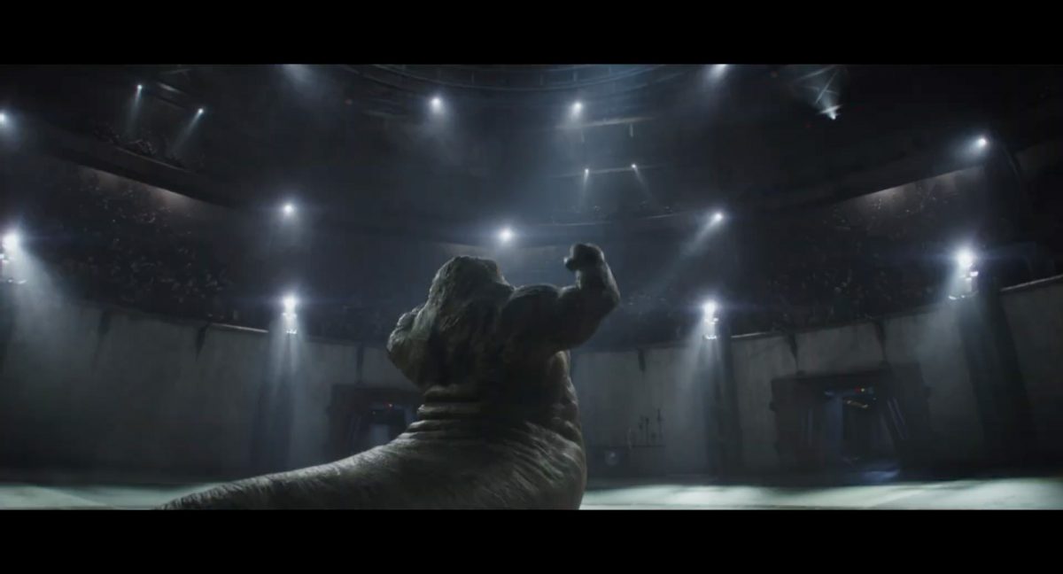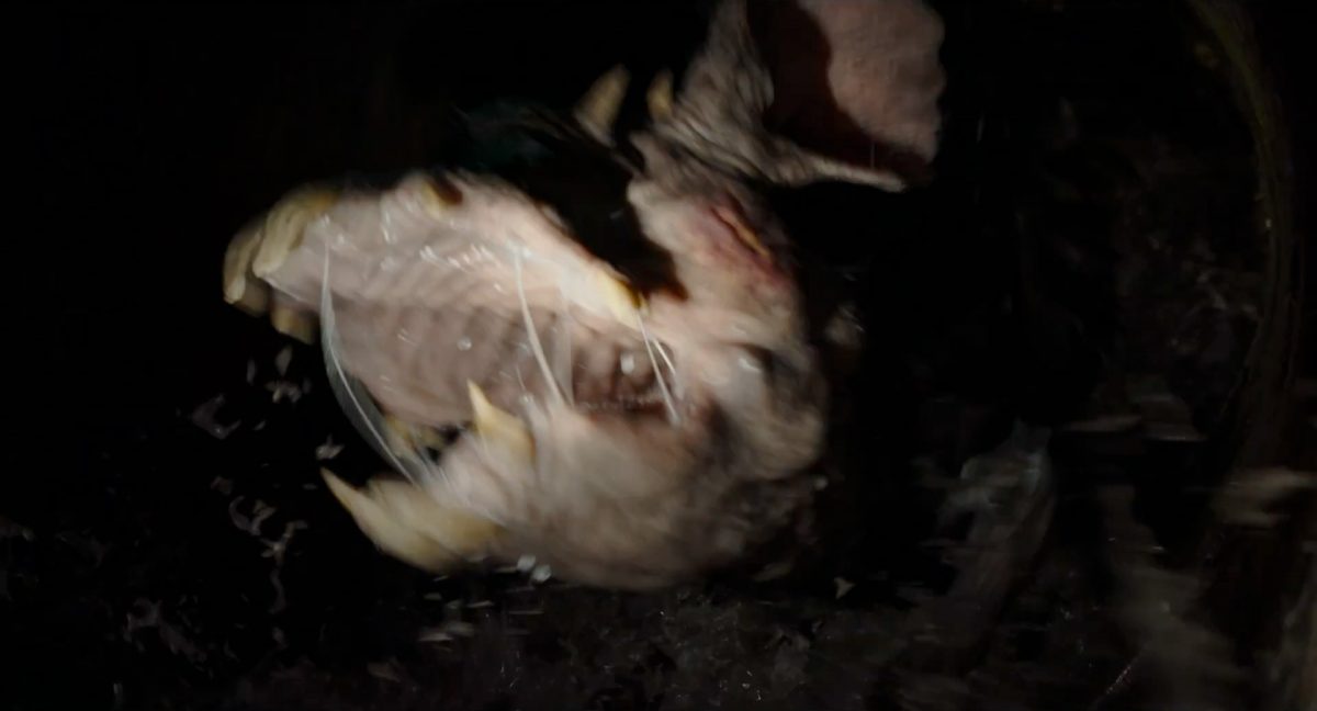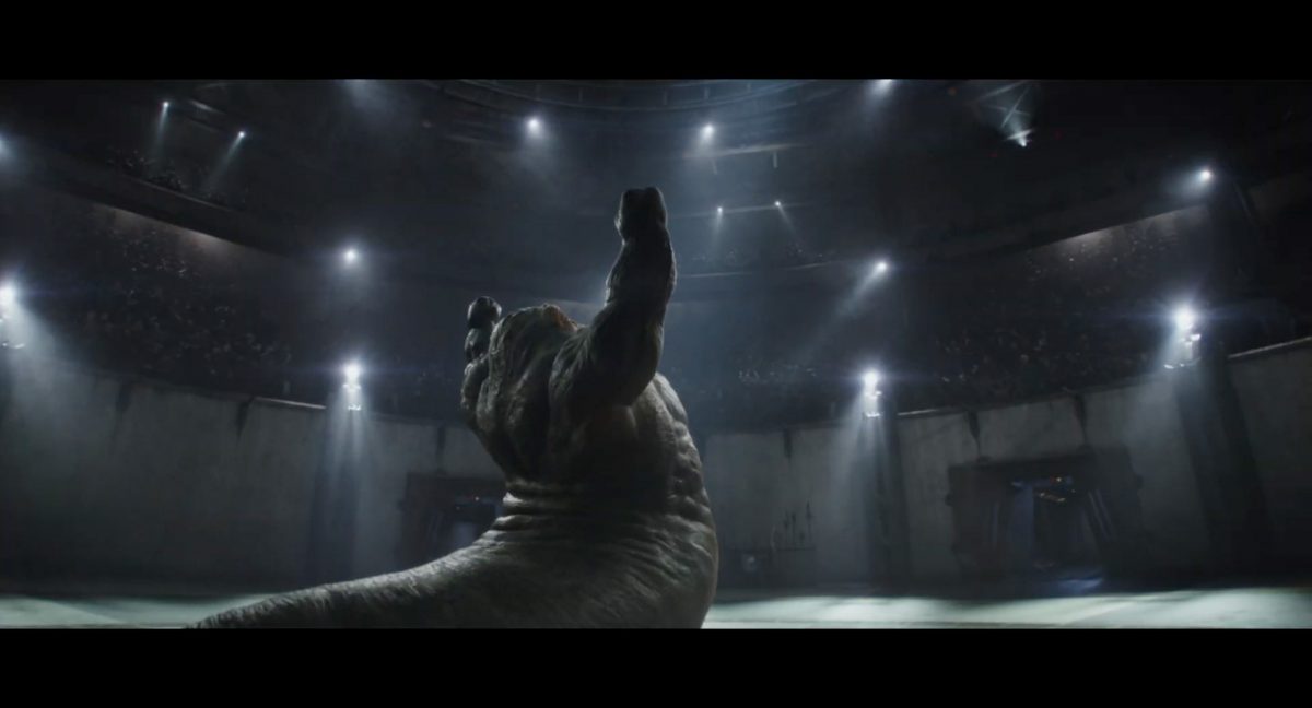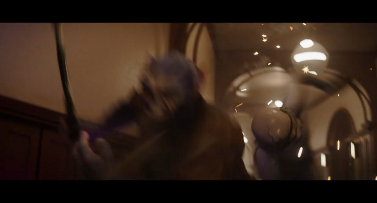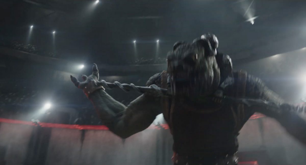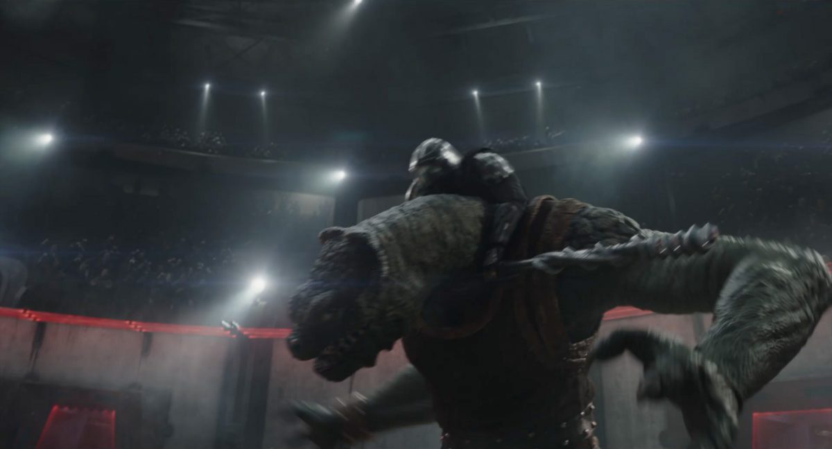Der Blasterbolzen verfehlt den vorwärts stürmenden Mandalorianer und schlägt unter grellen, alles erleuchtenden Funken im Boden ein.Din geht auf der anderen Seite sogleich hinter einem abgerundetem Rahmen in Deckung, sein Desintegrationsgewehr im Anschlag …… während der breitbeinige Zyklopen-Droide in Stellung tritt und seinen Handgelenksblaster wieder feuerbereit macht. Zugleich kommt auch der zweite Wächter an der Seite ins Bild.Als er anlegt, feuert Din einen gelblichen Blasterbolzen aus seinem Gewehr in die Hüftgegend seines größentechnisch überlegenen metallischen Gegners ab.Der Schuss trifft zwar, scheint aber keinen unmittelbaren Effekt zu erzielen.“ … ist …”Wir blicken in das brüllende Antlitz eines mantellianischen Savrips. Diese Spezies kennt man vor allem als Spielfigur aus dem Holo-Dejarik-Spiel, welches erstmals in Episode IV: Eine neue Hoffnung an Bord des Millenium Falken gezeigt wurde.Er steht vor einem Tor mit rötlicher Laserfeld-Barriere und wird halb von einem Scheinwerfer beleuchtet, was den Verdacht nahelegt, dass wir uns in der Arena befinden, in welcher wir eben noch Rotta gesehen haben.Die folgende Einstellung bestätigt diesen Verdacht. Doch nicht der Hutte befindet sich im Kampf mit dem Savrip, sondern Din.Dieser klammert sich an eine Stange mit drumherum gewundenem Element (vielleicht eine zeremionelle Waffe?) vor dem Hals der tobenden Kreatur und kann sich so auf deren Rücken halten. Ein Blick fürs Detail offenbart, dass an der Wand der Rotunde weitere Speer-artige Nahkampfwaffen aufgestellt und zur allgemeinen Verfügung bereitstehen.Der Savrip versucht, des mandalorianischen Ärgernisses auf seinem Rücken habhaft zu werden, doch viele von uns werden das Problem kennen: Man erreicht einfach nicht die richtige Stelle, um sich da mal ordentlich zu kratzen, wo es dringend nötig wäre.Der Belustigung der Menge scheint dies keinen Abbruch zu tun.Die Vollendung der Texteinblendung und des gängigen Zitats aus der Serie: