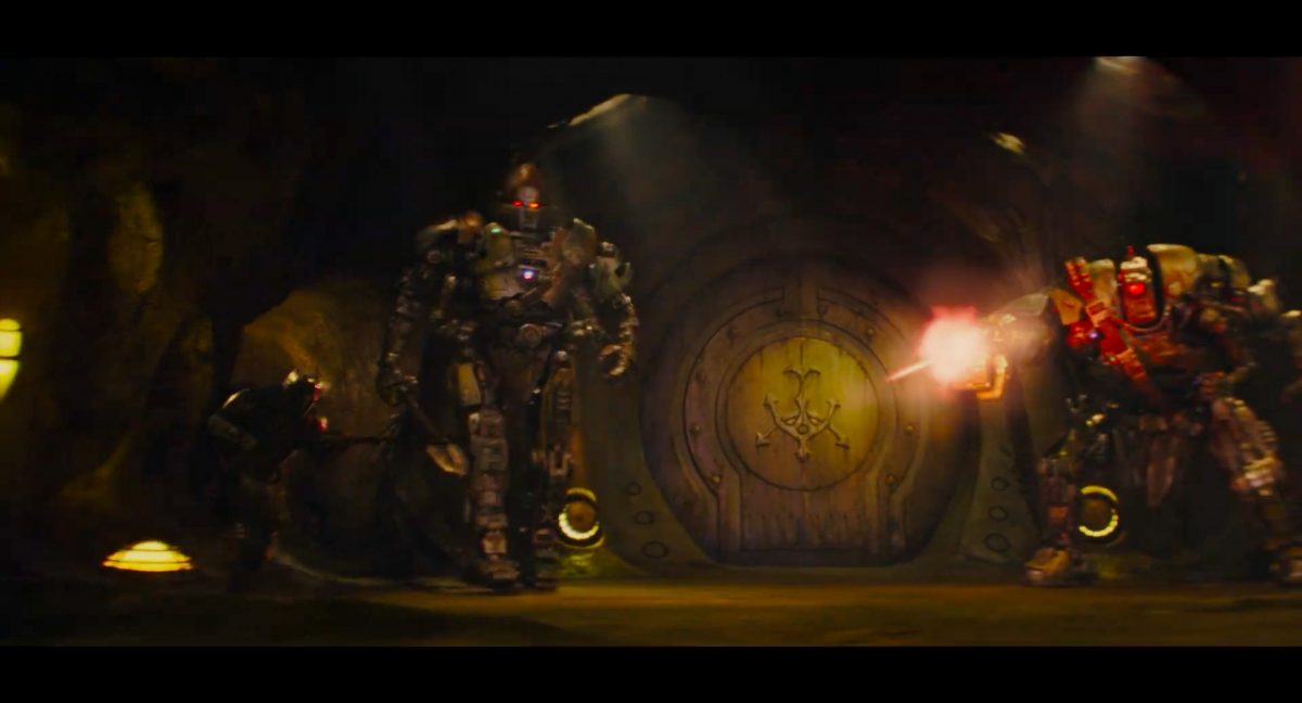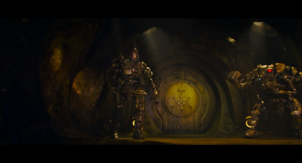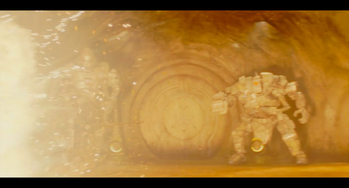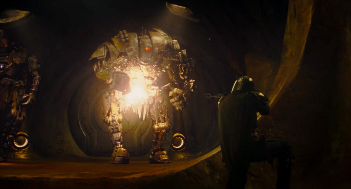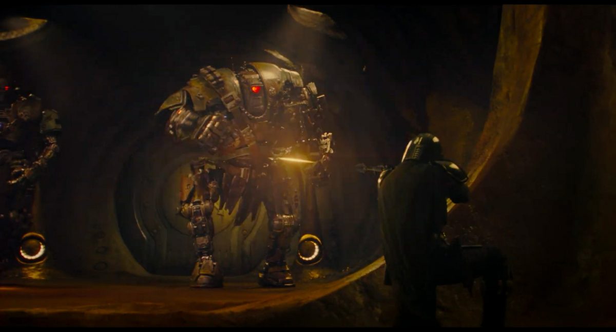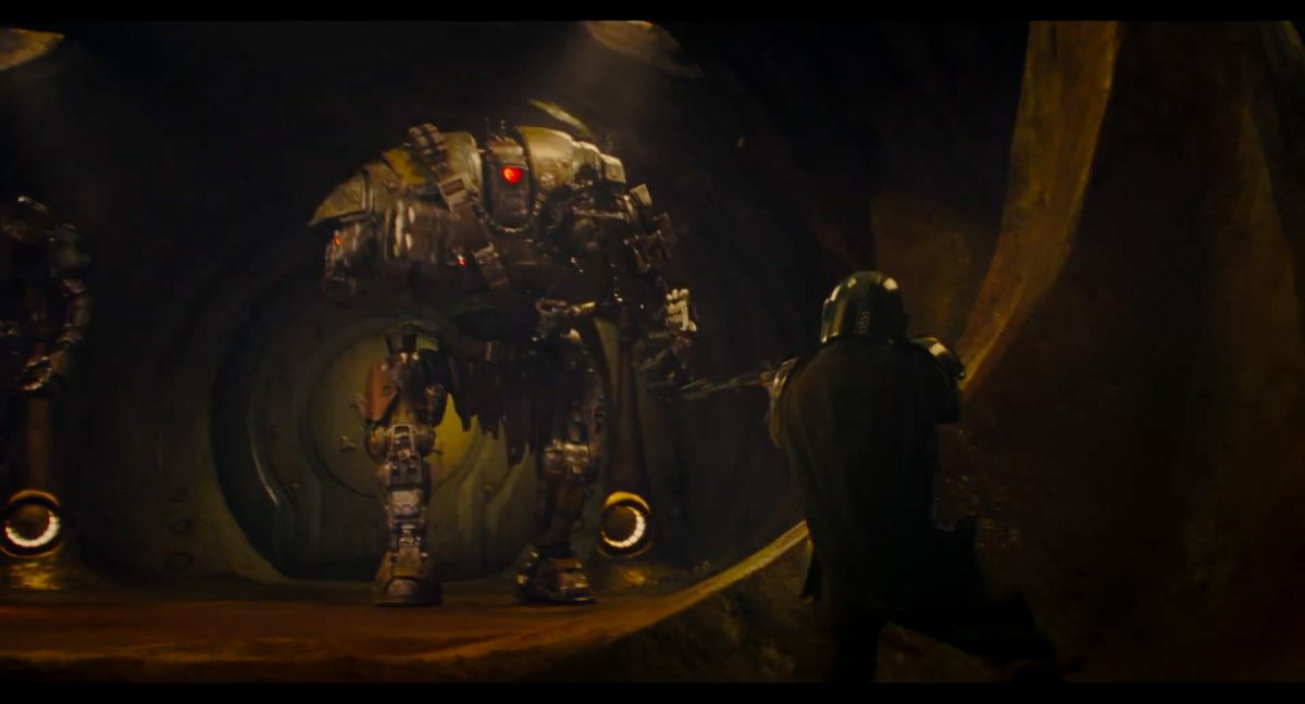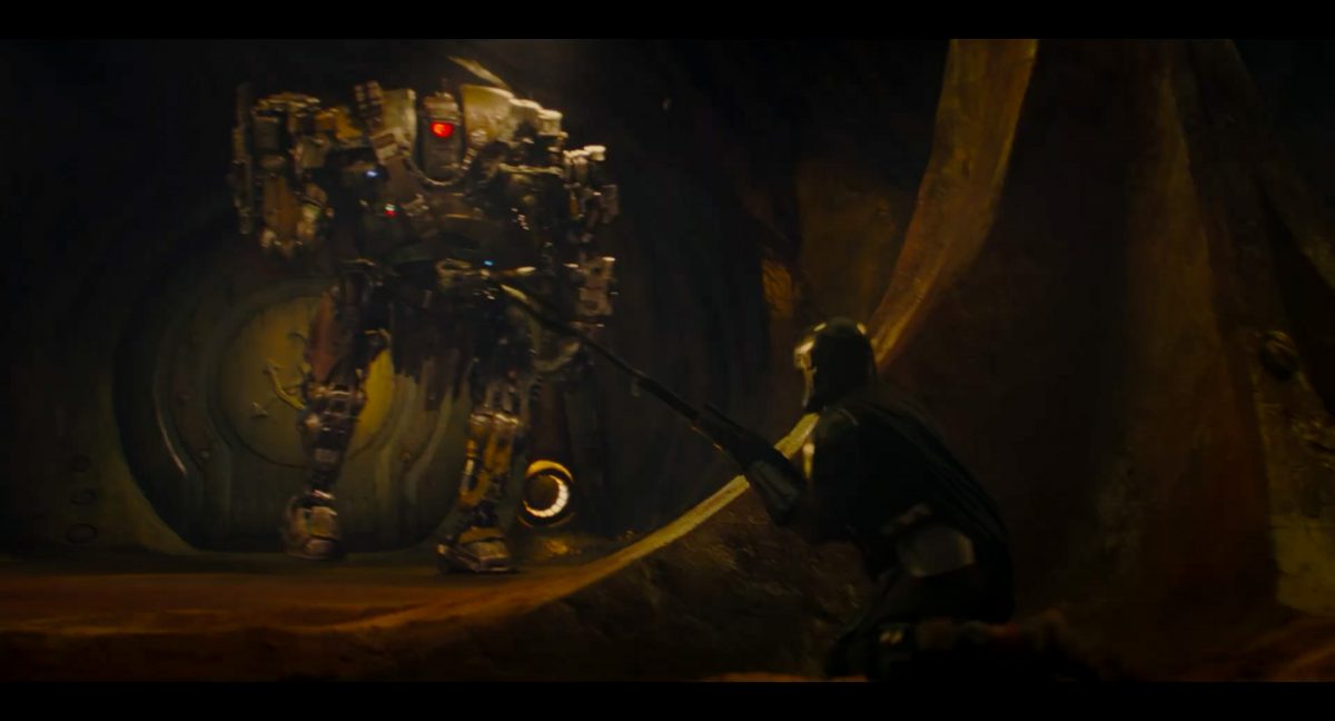 “Yeees!!!” “Jaaa!!!”Auch Din und Grogu befinden sich gerade in der Publikumsmenge, bleiben aber vergleichsweise ruhig auf ihren Plätzen sitzen. Jedoch quittiert Din das soeben Erlebte mit einem einzelnen Wort der Anerkennung, welches so auch einst von Darth vader benutzt wurde:“Impressive.” “Beeindruckend.”Grogu seinerseits reagiert mittels des knuspernden Verzehres einer Nascherei, die er in einem weißen, eckigen Behältner vor sich hat. Es könnte sich dabei womöglich um eine Portion Mantell-Futter handeln, welches in The Bad Batch mit großer Freude von Wrecker und Omega verspeist wurde.Es folgt zum glorreichen Main Theme des Mandos eine Texteinblendung: “Das …”In einem breiten, unterirdischen Gang mit schwacher gelbgiftiger Lichtstimmung flankieren zwei riesige Droiden-Wächter mit je uniquem Design eine runde Tür, auf welcher groß und zentral auf versifftem gelblichen Metall das Logo des Hutten-Kartells prangt. Die Szenerie erinnert stark an den Eingangsbereich des Hutten-Palasts auf Nal Hutta, wie wir ihn mehrmals in The Clone Wars zu sehen bekamen.Die beiden Droiden wirken wie aus verschiedenen Bestandteilen wild zusammengeflickt und tragen je einen Waffengürtel schräg über ihre Oberkörper sowie Lendenschurze. Der Linke hat einen gelben und einen roten Photrezeptor, einen ovalen Kopf, eine Systemanzeige auf im Brust-Bereich und schwingt eine Art Nahkampfwaffe, womöglich eine Keule. Der rechte Droide sticht designtechnisch durch den einzelnen enormen roten Photorezeptor hervor, welcher den Großteil seines zwischen den Schultern eingesunkenen Kopfes ausmacht. Zudem verfügt er über eine riesige Faust mit darüber angebrachter Zwillingsblasterkanone, was stark an die B2-Superkampfdroiden erinnert.Din stürmt von links in das Bild und wird sogleich von dem rechten Droiden-Wächter unter Beschuss genommen.