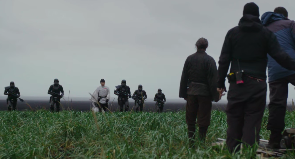 So oder so kristallisiert sich aber eine zeitliche Abfolge der Haupthandlung heraus: Yavin für den Start der Mission, verschiedene Anwerbewelten für das Team, darunter das offenbar kältere Eadu, das mutmaßlich auf Island gefilmt wurde und Jedha und schließlich Scarif mit dem Todessternlabor und dem Missionsabschluss.